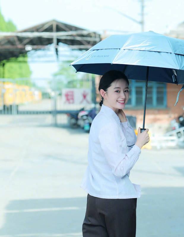 郭曉婷身着襯衫,手持藍傘回眸,笑容明媚,充滿生活氣息。