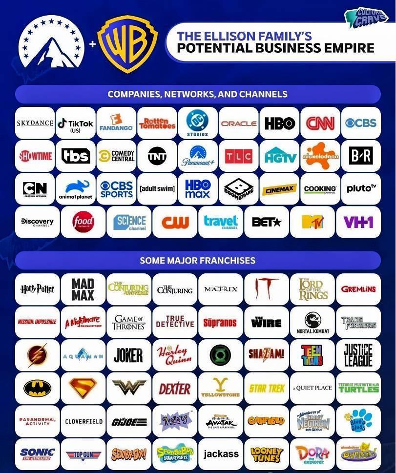 層層累積之下,纔有了這場“蛇吞象”的交易。此次收購完成後,派拉蒙將通過HBO、DC、CNN等業務補全IP、有線電視等方面的短板,目標直指美國第三大傳媒帝國,被認爲將對標默多克新聞集團。