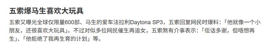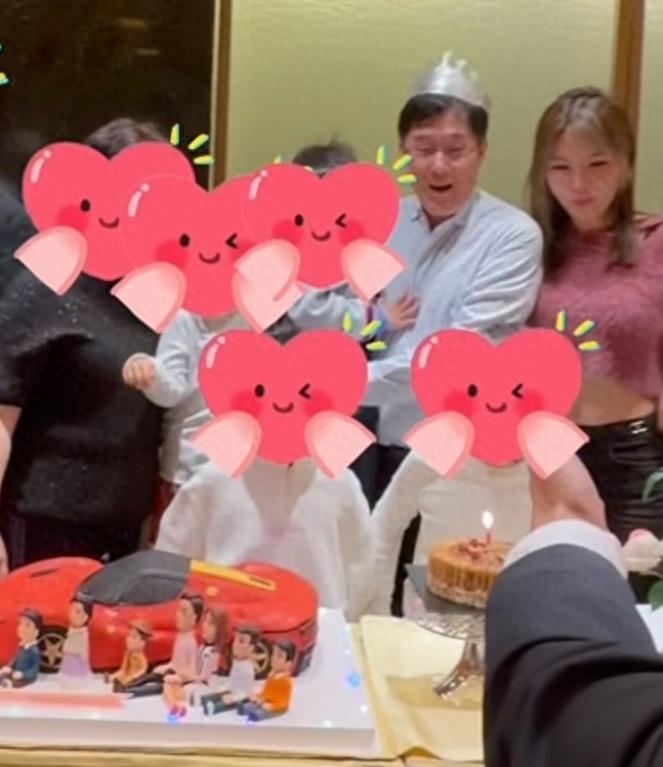 這次生日,五索給馬清鏗準備了一個巨大的定製蛋糕,蛋糕主體是馬清鏗最愛的法拉利跑車,兩人帶着五個孩子坐成一排,可想而知五索給前夫生的大兒子也帶在身邊,馬清鏗也接受這個繼子的存在。