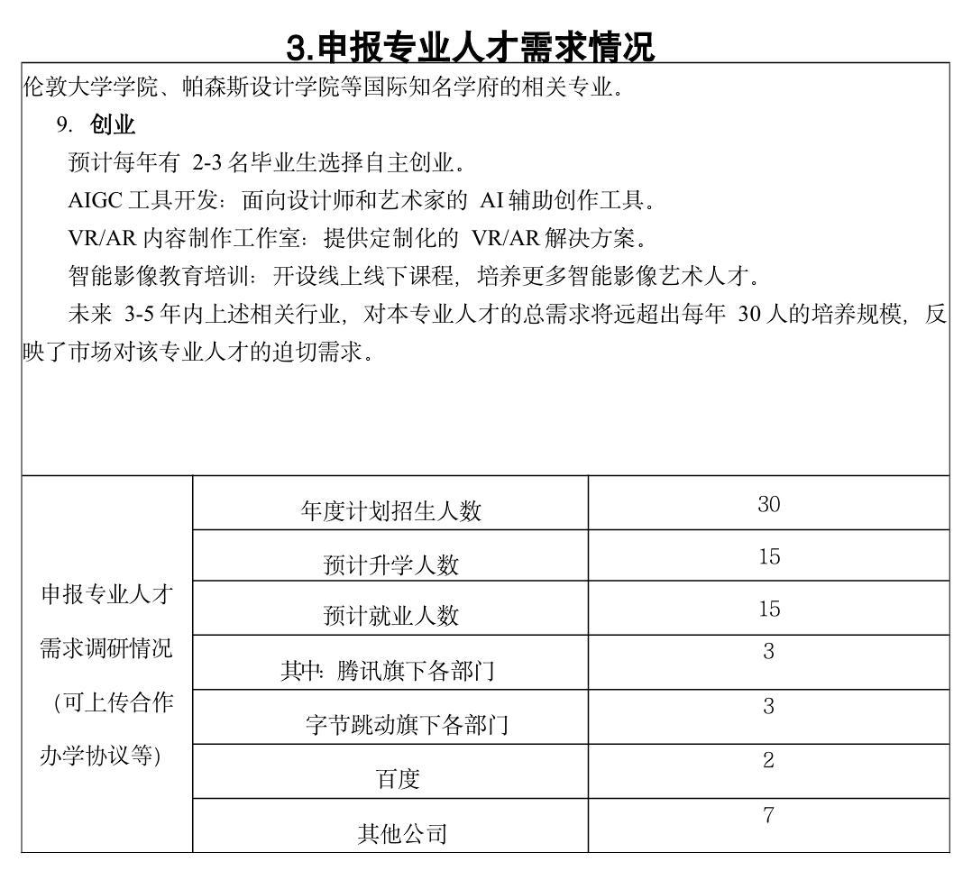 據中傳“智能影像藝術”專業申報表估計,每年度該專業計劃招生30人,升學和就業各佔一半,預計學生會選擇騰訊、字節、百度等大廠就業。
