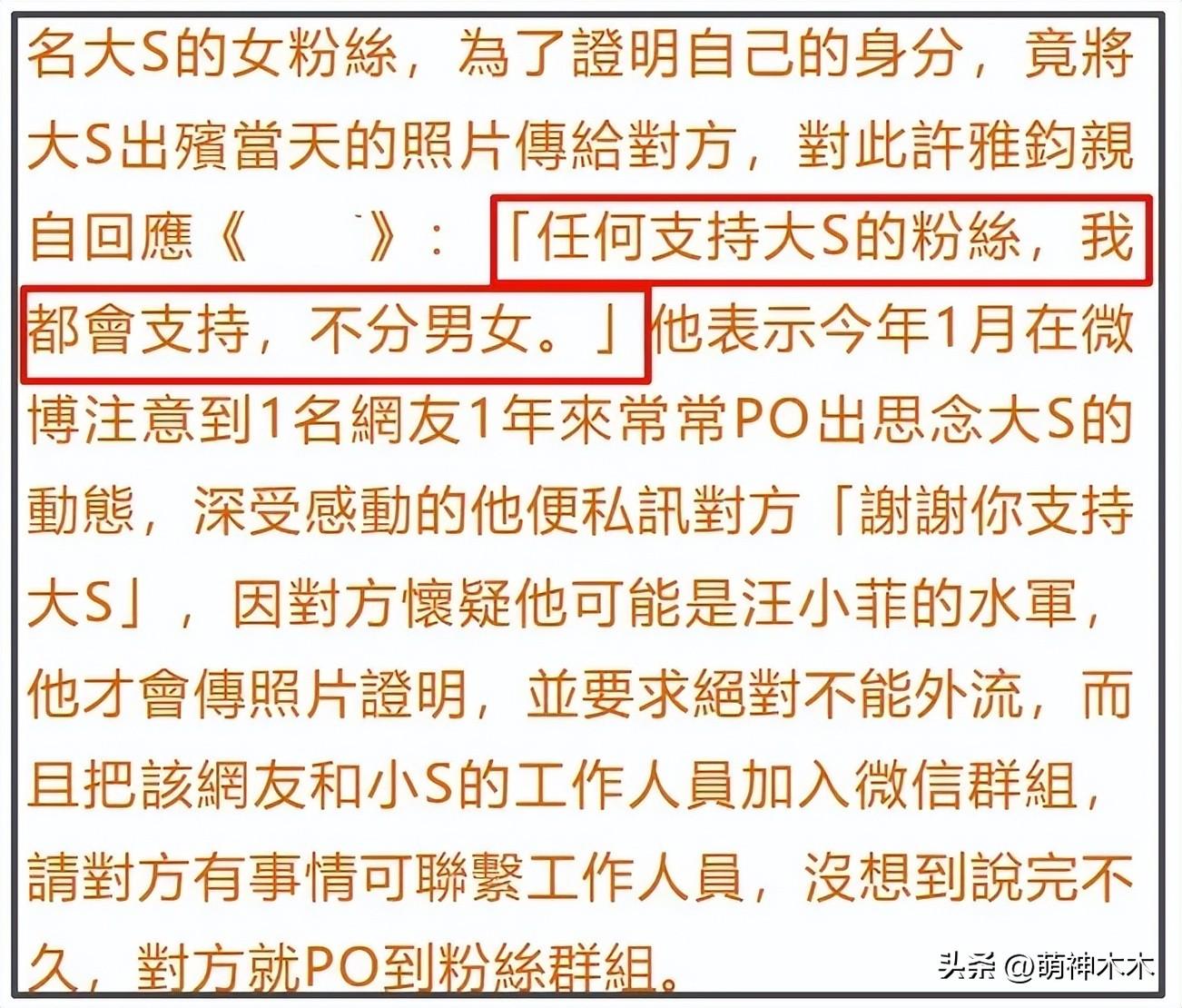 不知道是不是因爲大S粉絲手握聊天記錄這一無法辯駁的實錘,許雅鈞無法撒謊,回應臺媒的時候顯得有些慌不擇路,上來就是一句“任何支持大S的粉絲,我都會支持,不分男女”。