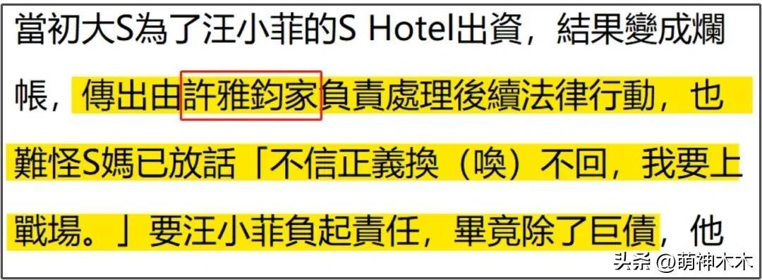 大S生前和汪小菲因爲酒店投資有爭議,在大S離世之後,臺媒爆料許雅鈞家負責處理相關法律事務。