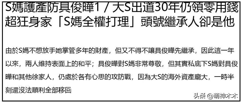 前段時間,臺媒還爆料大S生前把錢都給了S媽,由S媽操作資產轉移,不出意外,海外賬戶中的錢應該是大S留下的最大遺產。