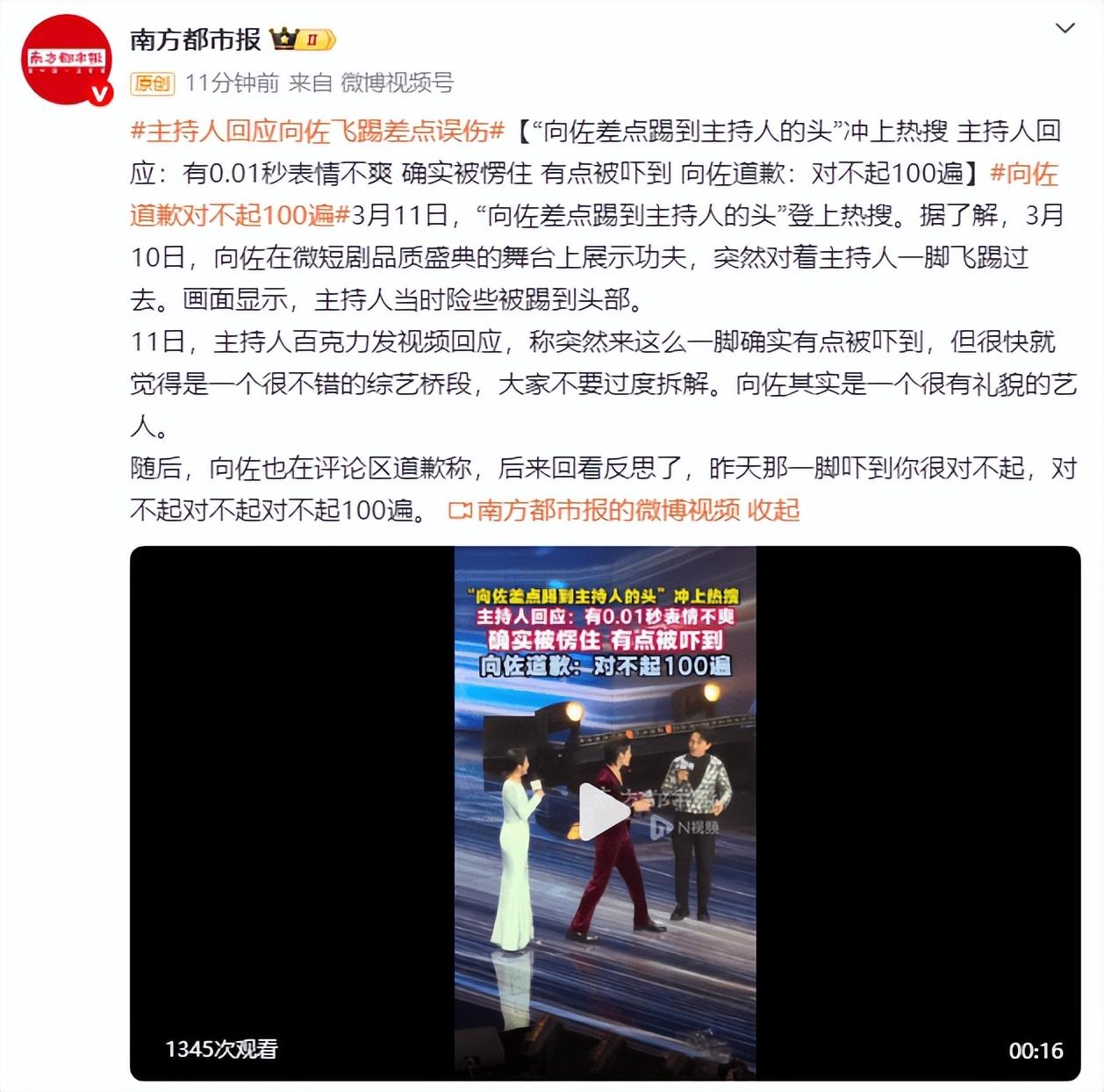 3月11日,“向佐差點踢到主持人的頭”登上熱搜。據瞭解,3月10日,向佐在微短劇品質盛典的舞臺上展示功夫,突然對着主持人一腳飛踢過去。畫面顯示,主持人當時險些被踢到頭部。