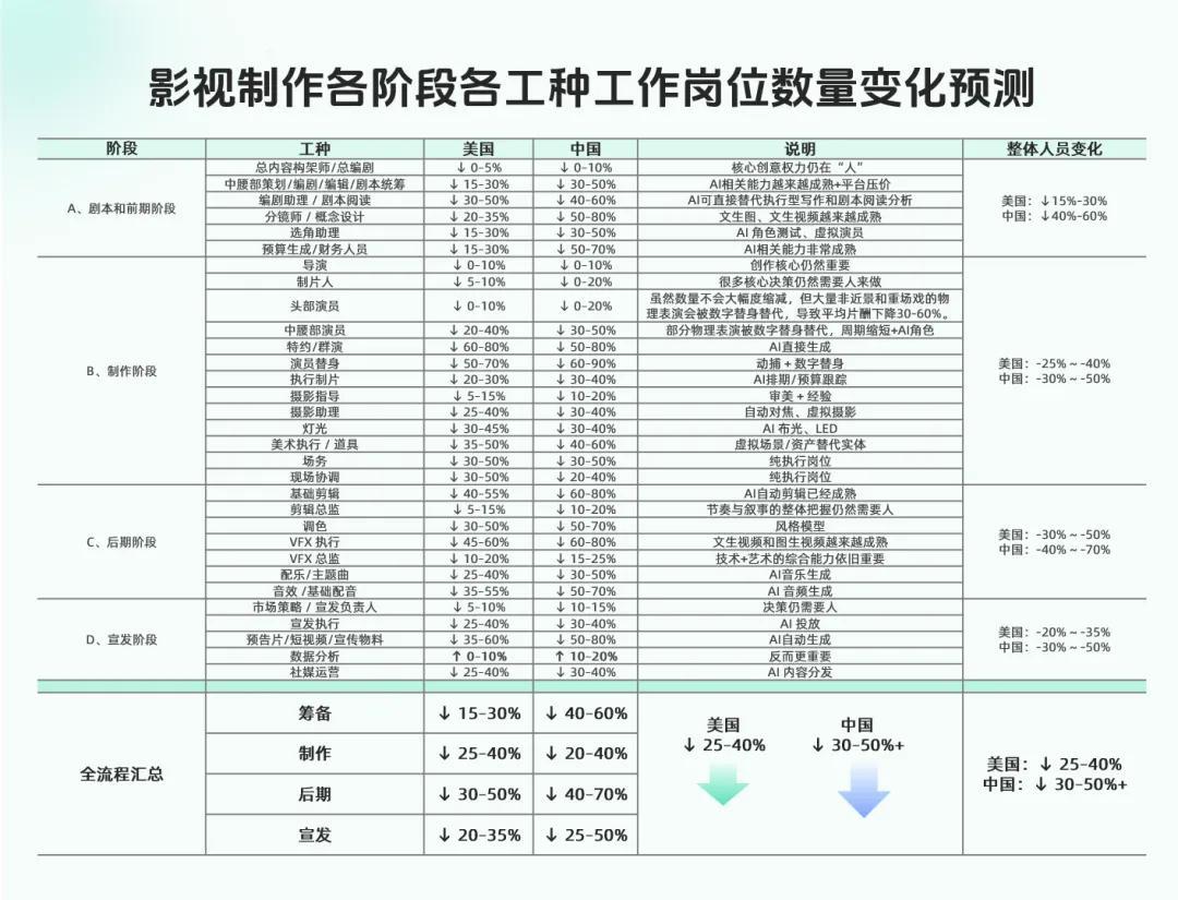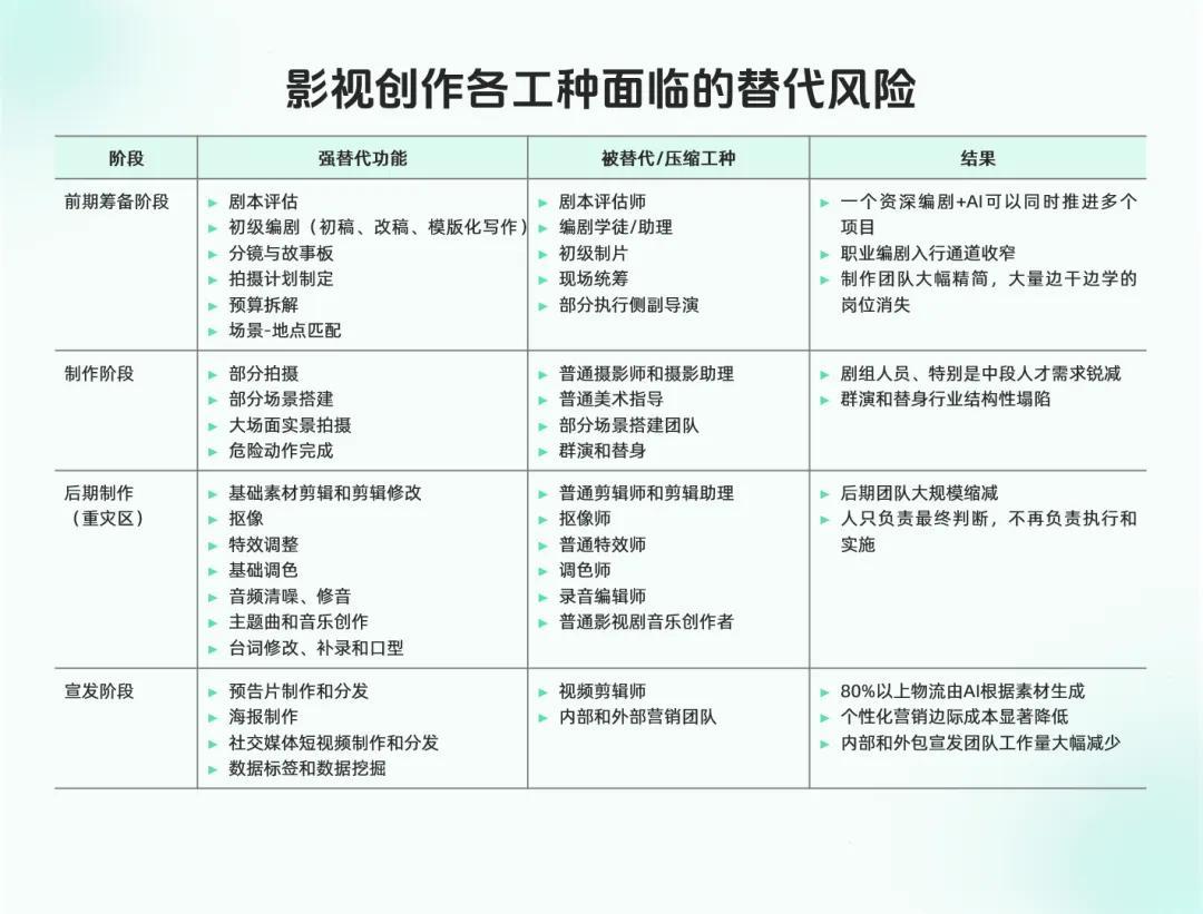 - 隨着AI真人大量佔據影視作品,對真人演員的需求整體上會大幅縮減,其中頭部演員的單項目工作時長和收入模式會發生結構性改變,前端固定收費將會明顯下降;中腰部演員會被大面積擠壓和替代;羣演和替身行業基本消失;新人入行路徑會發生顯著變化。