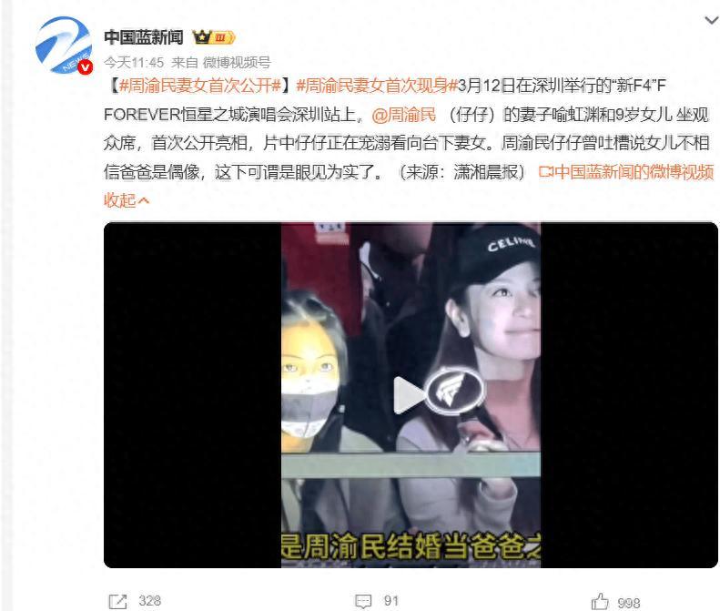 3月12日在深圳舉行的“新F4”F FOREVER恆星之城演唱會深圳站上,“仔仔”周渝民 的妻子喻虹淵和9歲女兒坐觀衆席,首次公開亮相,片中仔仔正在寵溺看向臺下妻女。周渝民仔仔曾吐槽說女兒不相信爸爸是偶像,這下可謂是眼見爲實了。