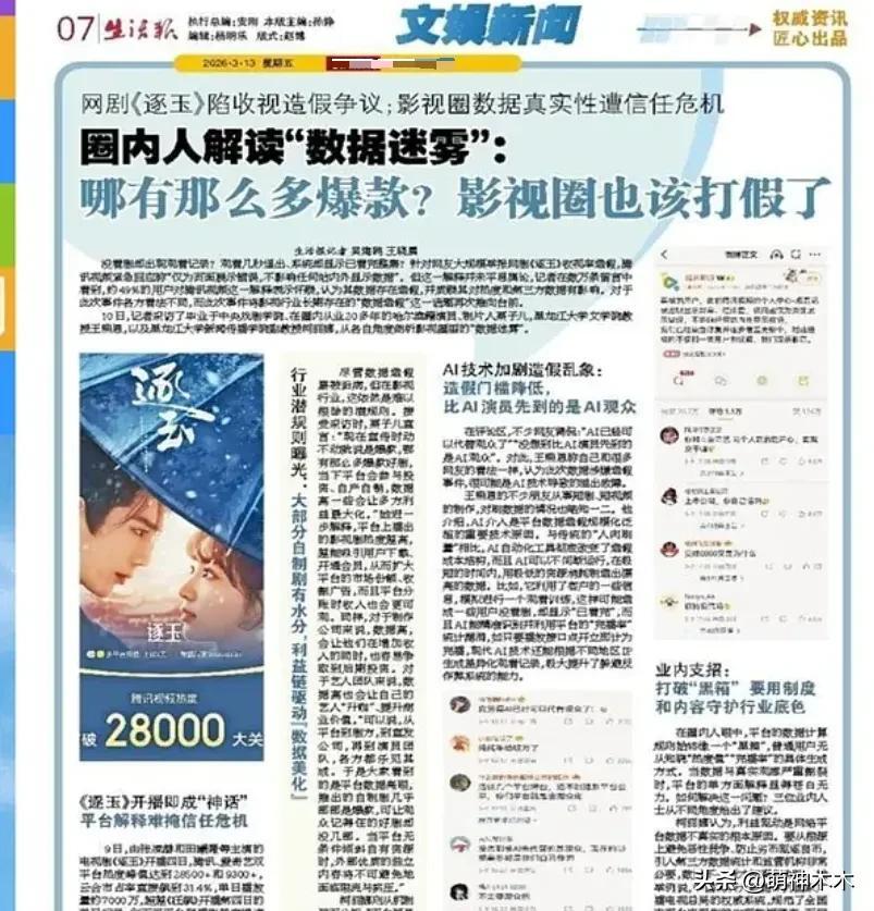 黑龍江日報直接給了《逐玉》造假風波一個版面,整個版面最顯眼的一行字就是“哪有那麼多爆款,影視圈也該打假了”。