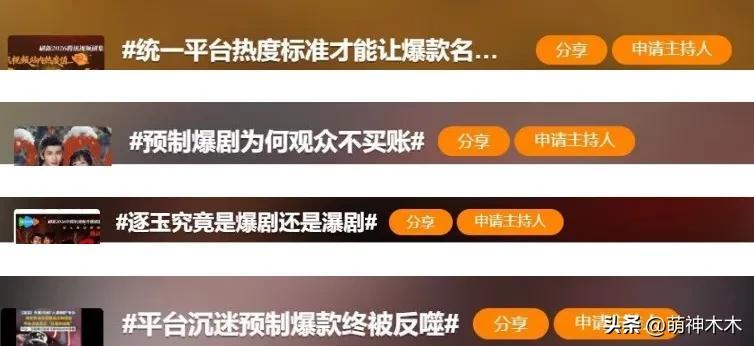 圍觀一下各家媒體發聲帶上的話題,都是“統一平臺熱度標準才能讓爆款名副其實”、“預製爆劇爲何觀衆不買賬”、“逐玉究竟是爆劇還是瀑劇”、“平臺沉迷預製爆款終被反噬”。