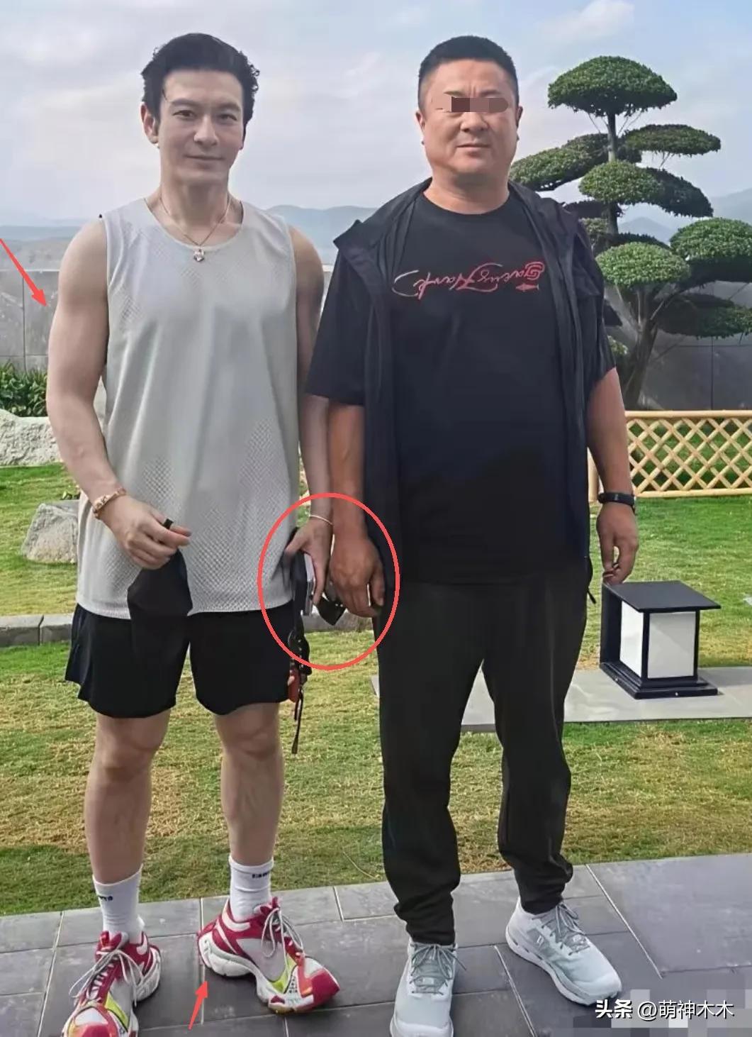 照片中,黃曉明穿着全套的運動裝備,灰色背心搭黑色運動褲,手臂肌肉和小腿肌肉鍛鍊痕跡明顯,身材在中年人羣體中可以說保持得相當不錯。只是經不得細看,尤其是身材比例,從頭頂和肩部高度來看,男網友和黃曉明身高高度基本一致,但是兩個人的手臂長度一長一短,黃曉明的手比男網友短了半截,於是評論區的網友開始積極討論身高話題。