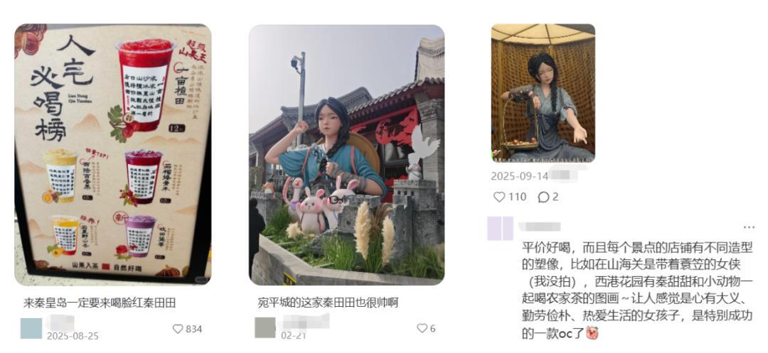 還有一條需要天時地利人和的小衆路線,是和區域文旅緊密結合。除了人們耳熟能詳的茶顏悅色,河北的臉紅秦田田也是這個賽道的代表:這個品牌來自秦皇島的乾廣集團的文旅地產板塊,項目落地之初便和當地的助農產業和旅遊造景深度綁定,通過“格局”和“河北旅遊必喝”走紅。