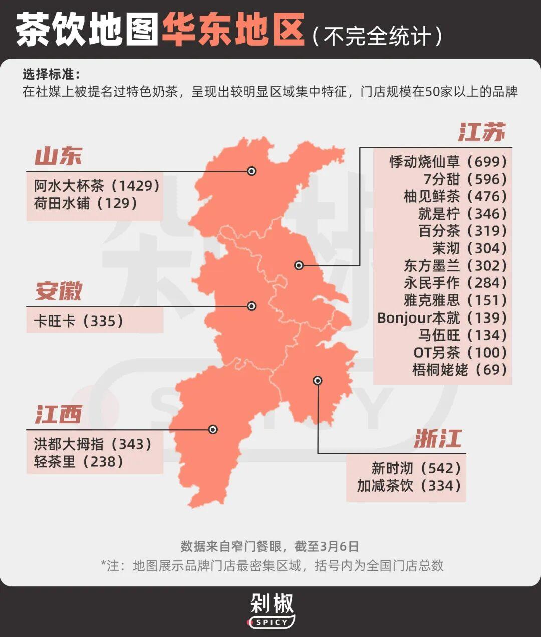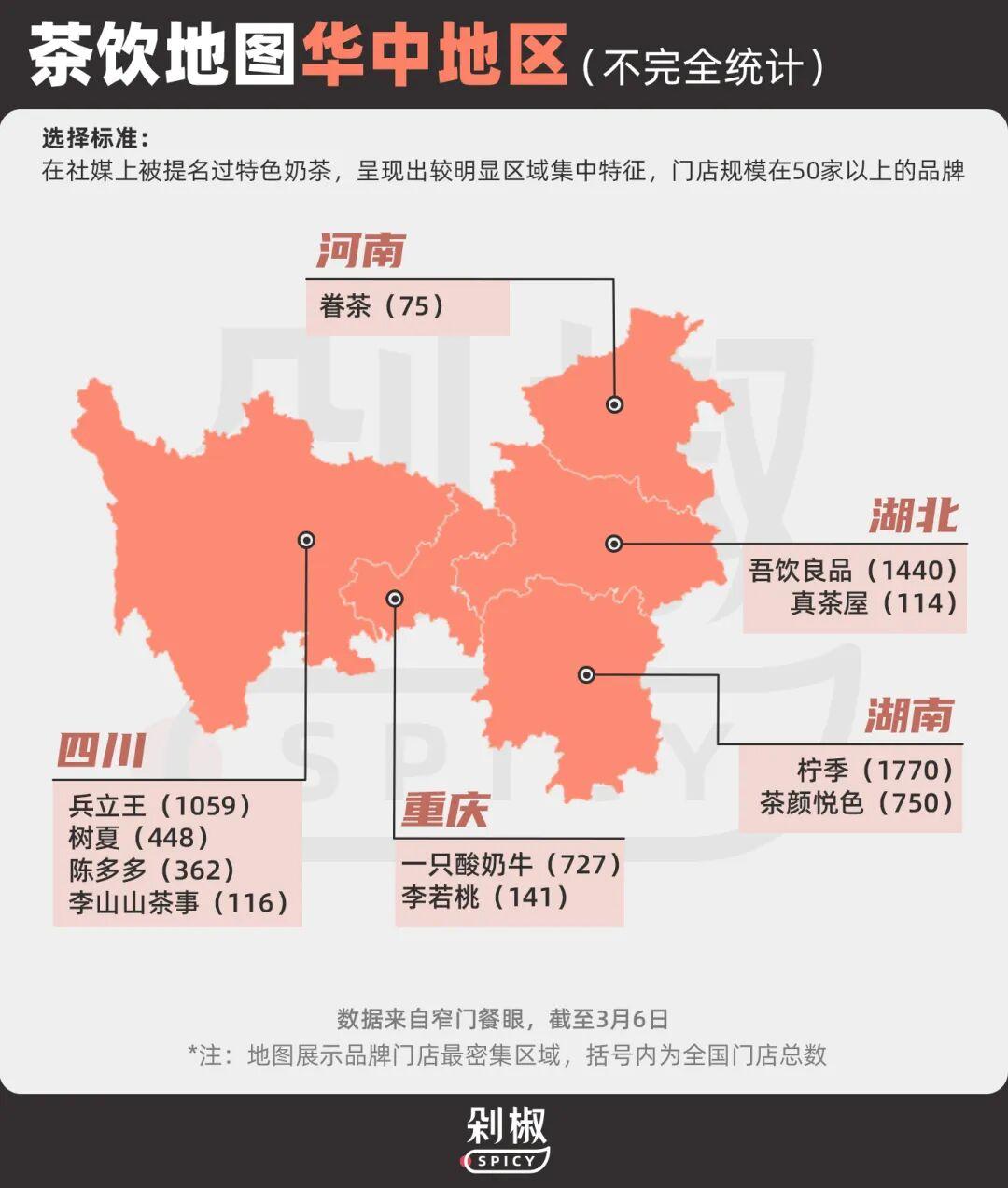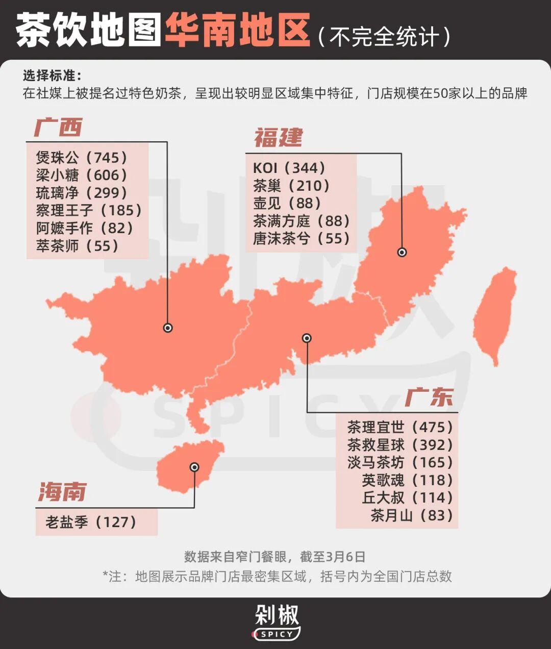 在窄門餐眼的全國數據庫中,一個叫省份集中度的指標能夠大致還原出品牌的地域特徵:例如,只在江西分佈的洪都大拇指集中度爲100%,而蜜雪冰城、霸王茶姬等全國性加盟品牌的集中度大多在8-15%左右。剁椒將省份集中度30%左右作爲分界線,結合社交媒體上的提名和評論,梳理了全國具有代表性和一定規模的區域茶飲品牌。