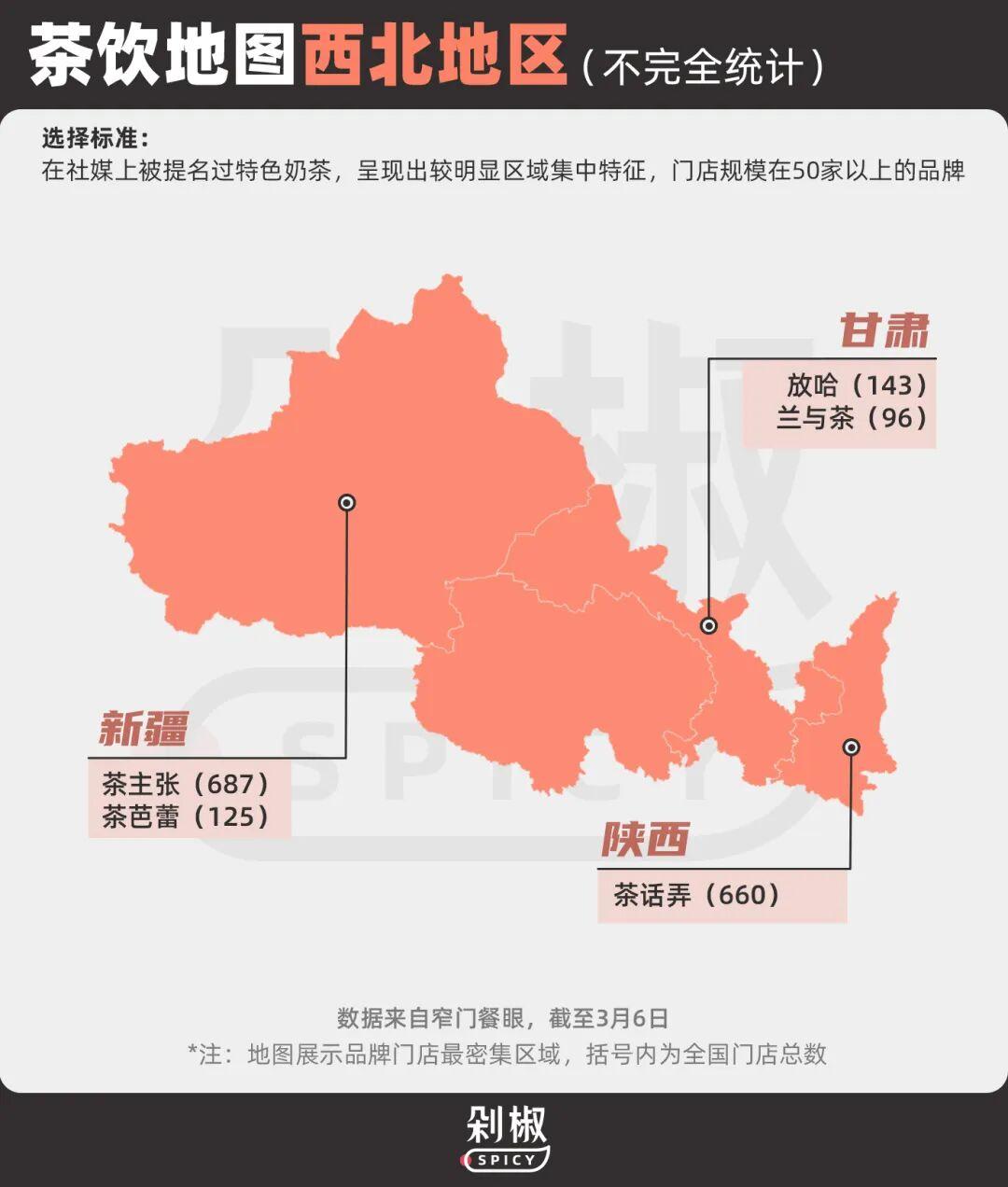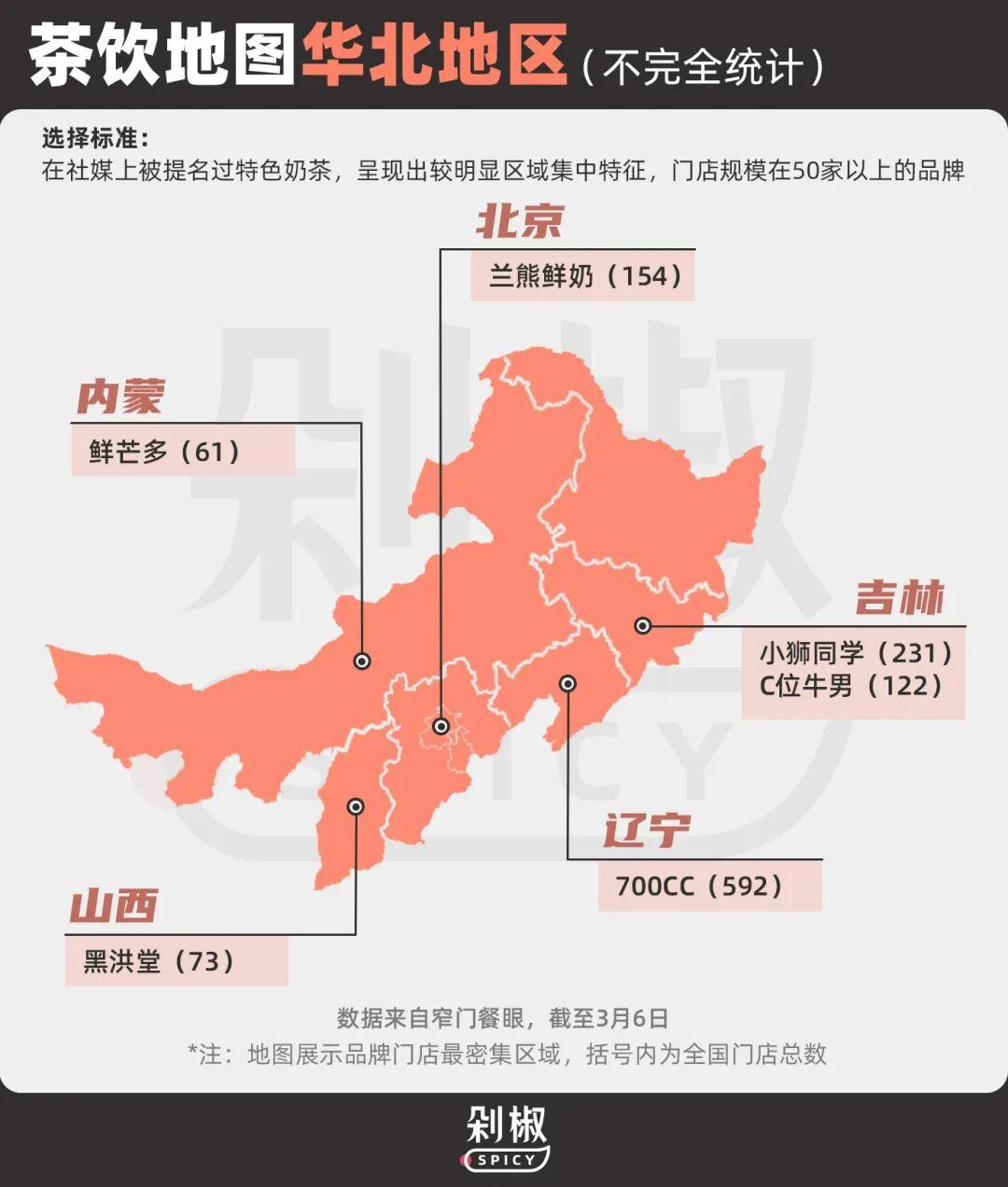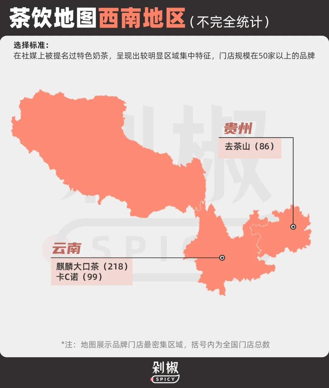在窄門餐眼的全國數據庫中,一個叫省份集中度的指標能夠大致還原出品牌的地域特徵:例如,只在江西分佈的洪都大拇指集中度爲100%,而蜜雪冰城、霸王茶姬等全國性加盟品牌的集中度大多在8-15%左右。剁椒將省份集中度30%左右作爲分界線,結合社交媒體上的提名和評論,梳理了全國具有代表性和一定規模的區域茶飲品牌。