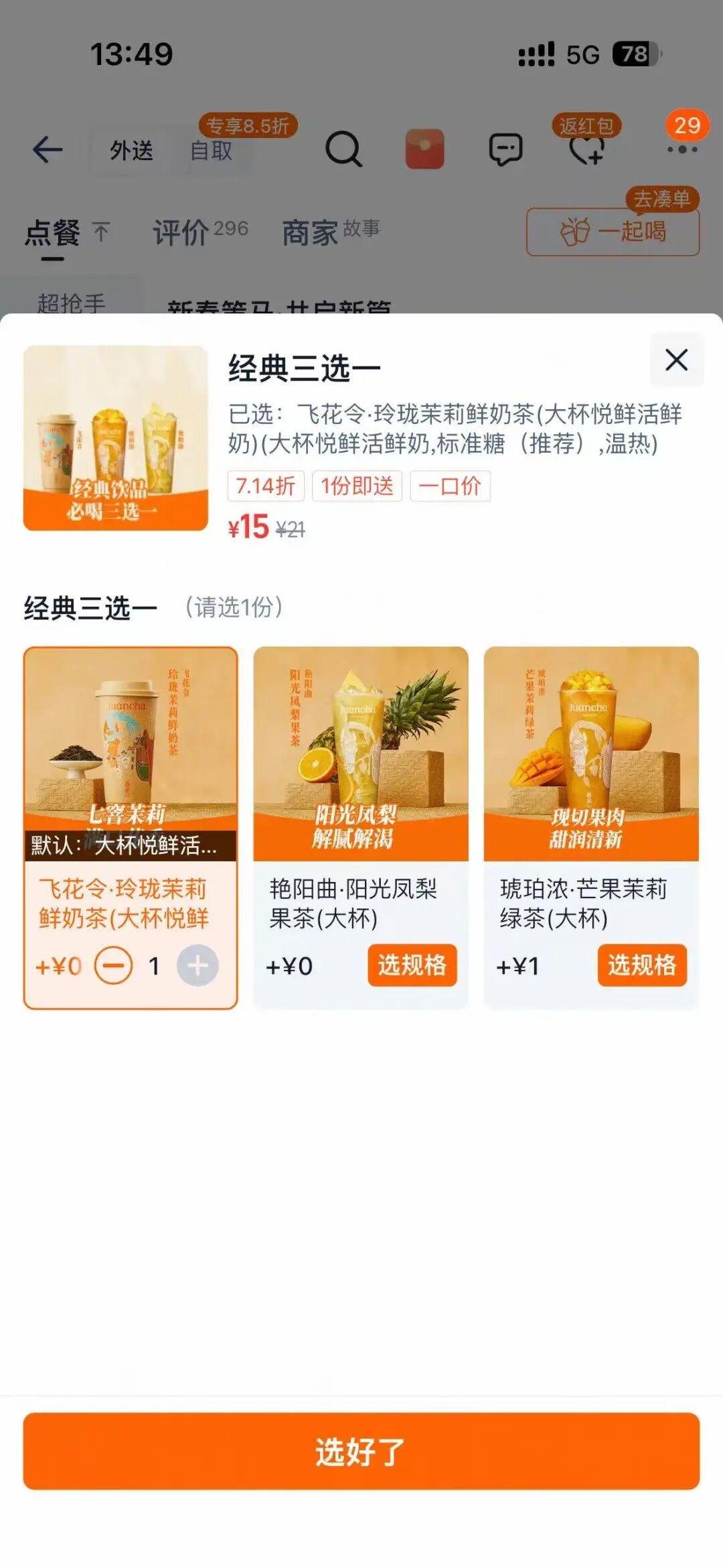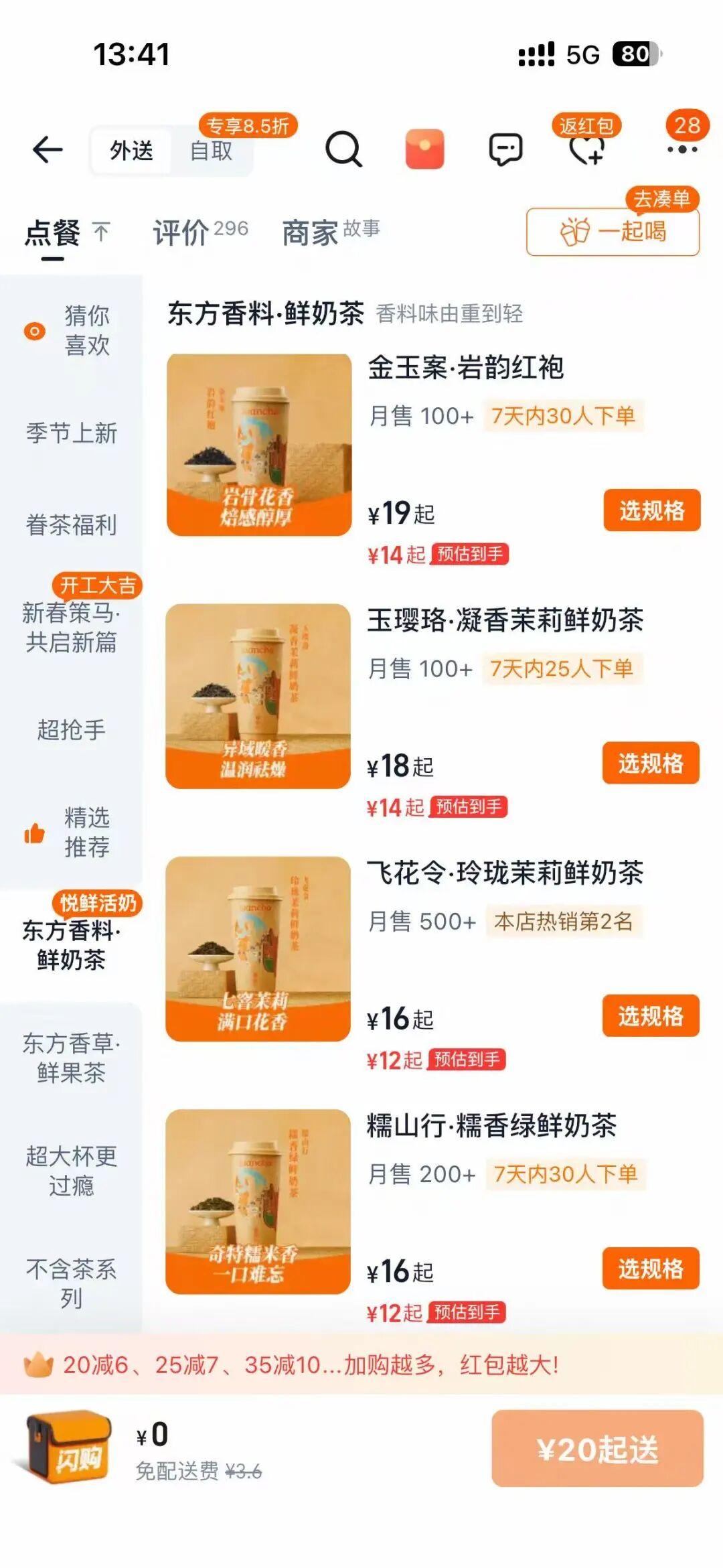在這樣的菜單排佈下,荊芥檸檬茶月銷300餘杯,位列門店第五,而門店月銷最高的則是口味常規,價格最低的茉莉奶綠。眷茶甄選對外賣平臺優惠券也開放得較爲慷慨,標準價位雖然稍高,但疊加外賣券後回到10-15元區間。有特色產品引流,基礎產品打底,眷茶甄選成功成爲了打工人的常規選項中比較有新意的那一個。