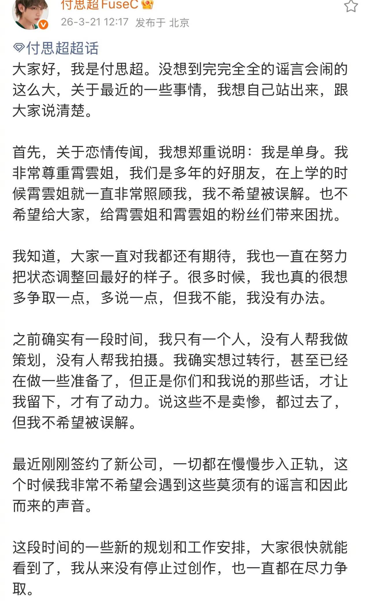 搜狐娛樂訊 21日,付思超在社交平臺上發文回應戀情傳聞,明確表示自己是單身,和黃霄雲是多年的好朋友,上學時對方就很照顧自己,不希望被誤解,也不想給彼此和粉絲帶來困擾。同時他也提到剛簽約新公司,一切步入正軌,未來會有新的工作規劃和安排,也從未停止創作。