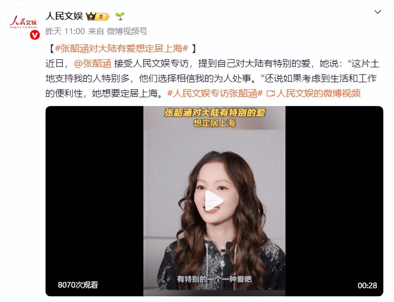 近日,張韶涵接受人民文娛專訪,提到自己對大陸有特別的愛,她說:“這片土地支持我的人特別多,他們選擇相信我的爲人處事。”還說如果考慮到生活和工作的便利性,她想要定居上海。