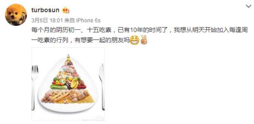 2016年時她曾發文稱自己初一十五喫素,堅持了10年時間。