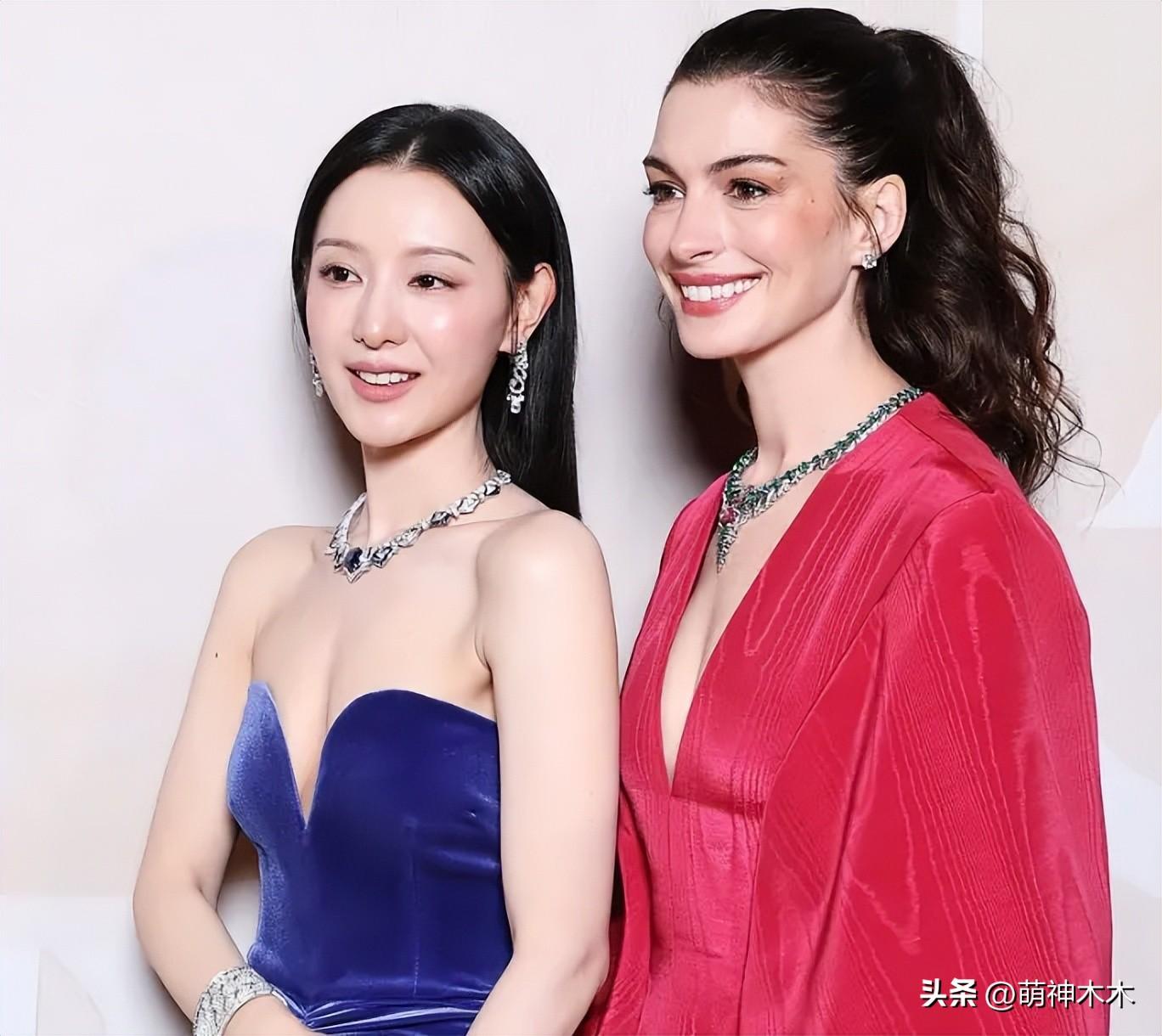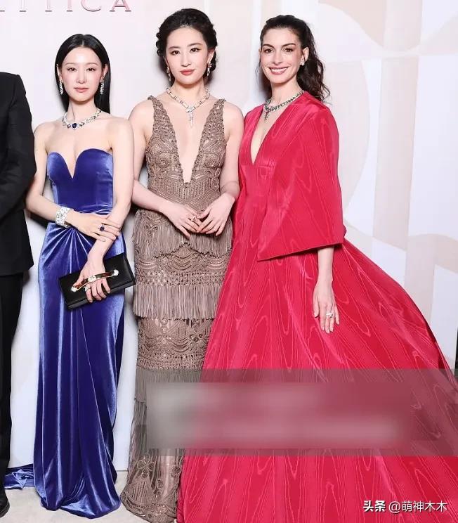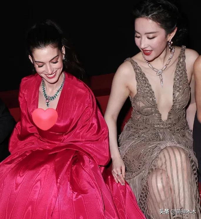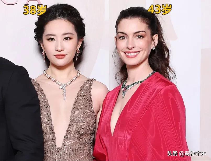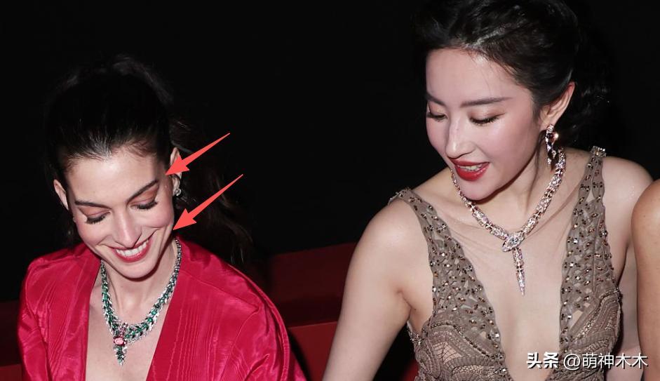 劉亦菲在內場和安妮海瑟薇同框,沒有多餘打光,同一視角下,海瑟薇笑起來又幹癟又顯老,粉嫩的妝造也沒能顯年輕,太陽穴凹陷看着像假人一樣。反倒旁邊的劉亦菲側着臉,鏡頭畸變下也能看出面色紅潤,元氣滿滿。