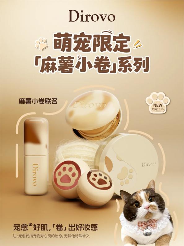 遇上聯名活動,“捲包材”便會更進一步:與網紅三花小貓麻薯小卷的聯名中,蒂洛薇爲參與活動的氣墊、散粉、脣釉脣蜜都重新設計了以三花毛色爲主題的新包裝,並配備了貓爪粉撲。