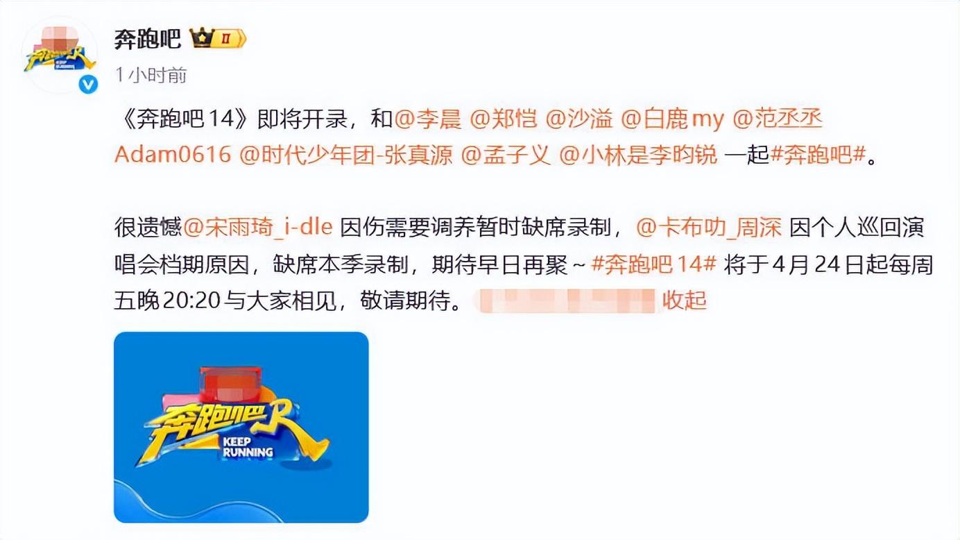 搜狐娛樂訊 25日,《奔跑吧》官方賬號發文稱宋雨琦與周深將缺席節目錄制:“很遺憾宋雨琦因傷需要調養暫時缺席錄製,周深因個人巡迴演唱會檔期原因,缺席本季錄製,期待早日再聚。”