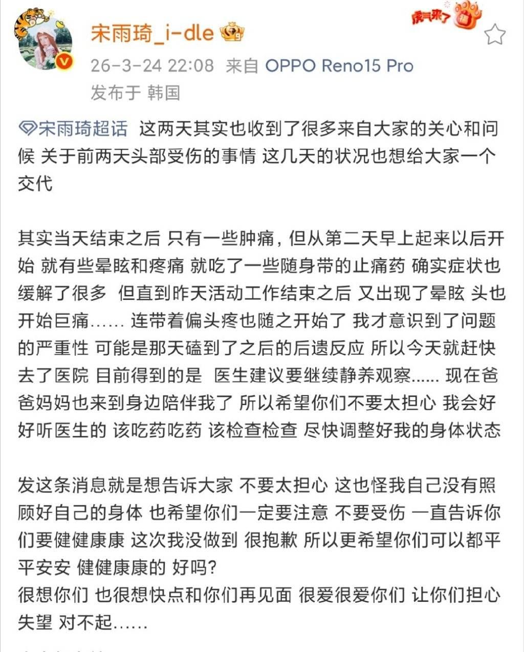 此前,宋雨琦在(G)I-DLE曼谷巡演期間頭部撞傷,次日出現持續眩暈和偏頭痛症狀,引發熱議!對此,宋雨琦發文回應稱自己已經去過醫院,醫生建議她要靜養!