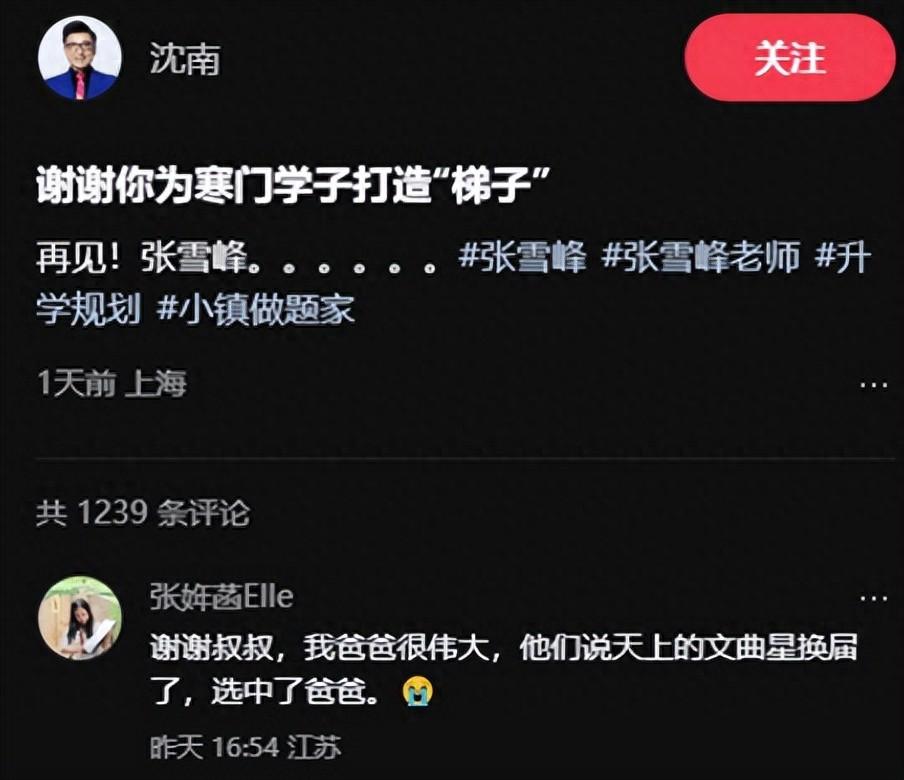 3月26日,主持人沈南發視頻悼念張雪峯,稱謝謝他爲寒門學子們打造了“梯子”。對此,張雪峯女兒張姩菡在評論區發文回覆稱:“謝謝叔叔,我爸爸很偉大,他們說天上的文曲星換屆了,選中了爸爸。”