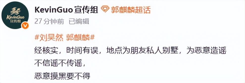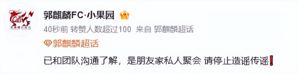 對此,郭麒麟對接回應表示:“已和團隊溝通了解,是朋友傢俬人聚會,請停止造謠傳謠。”另外宣傳組還補充稱:“地點爲朋友私人別墅”。