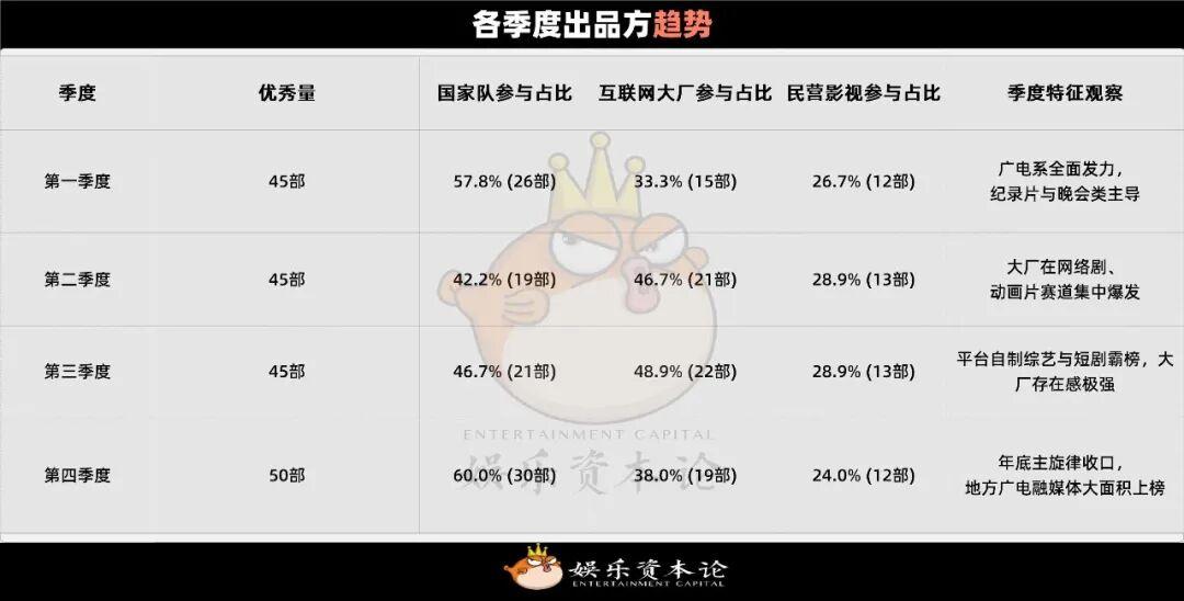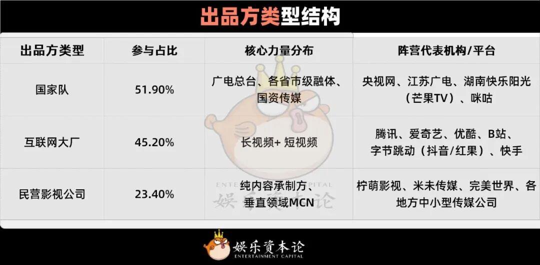 好內容離不開好推手。當娛樂資本論穿透這近397部作品背後的出品方結構時,一幅“國企+大廠+民營”協同作戰的生動圖景躍然紙上。
