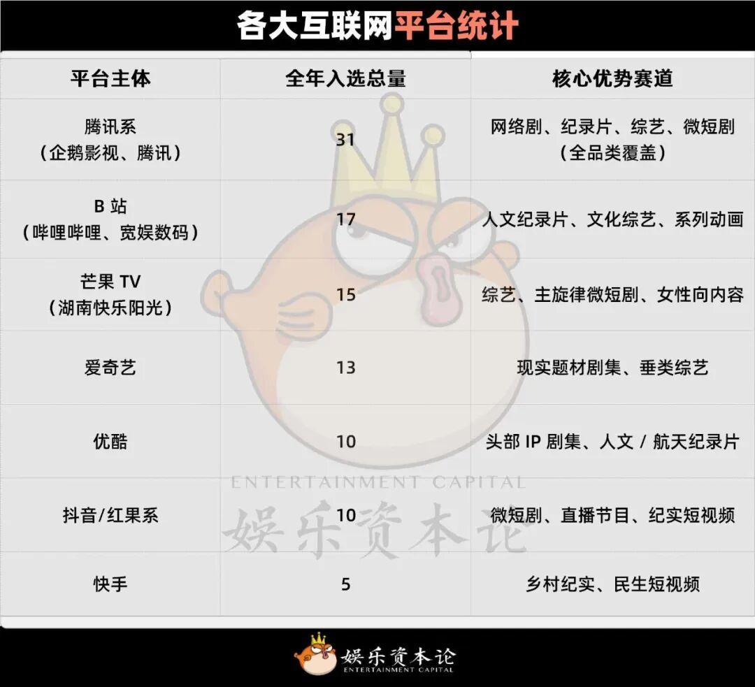 ·長視頻御三家(愛優騰) 依然是高品質劇集和大型綜藝的造夢者,持續輸出着極具商業價值與社會意義的頭部IP。其中騰訊系(企鵝影視、騰訊)全年入選31部,全品類覆蓋了網絡劇、紀錄片、綜藝、微短劇等賽道,證明了深厚的實力。