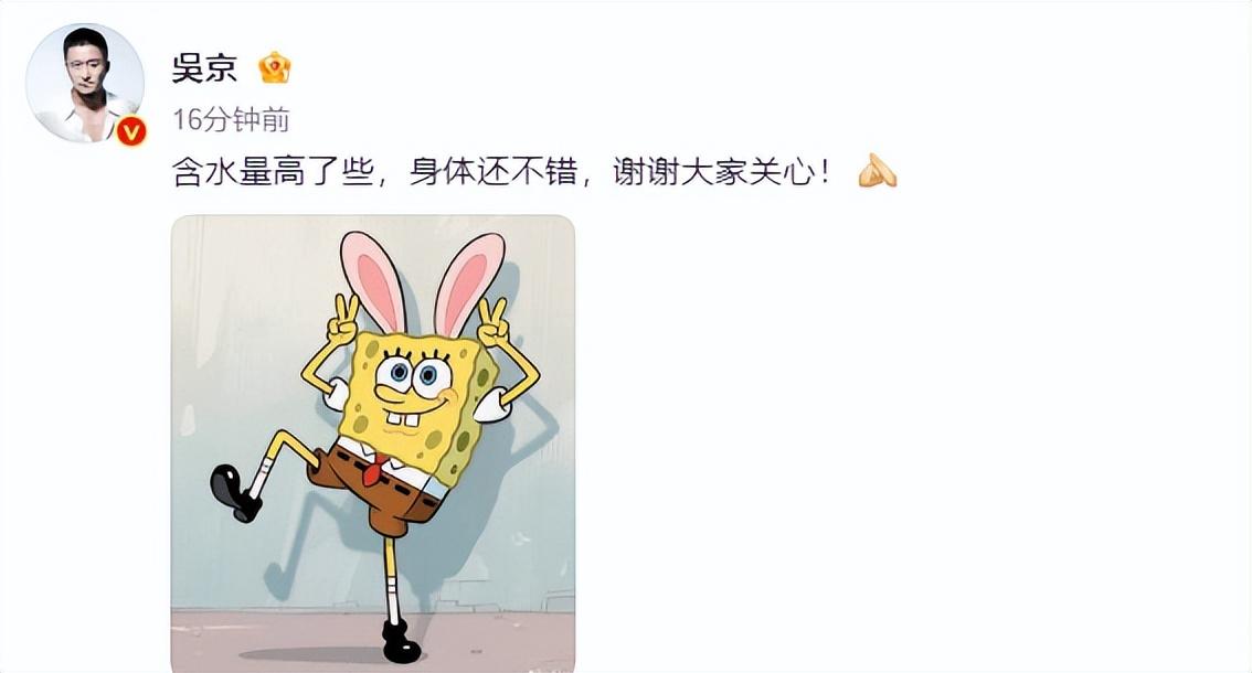 27日下午,吳京發文回應此事,稱:“含水量高了些,身體還不錯,謝謝大家關心!”
