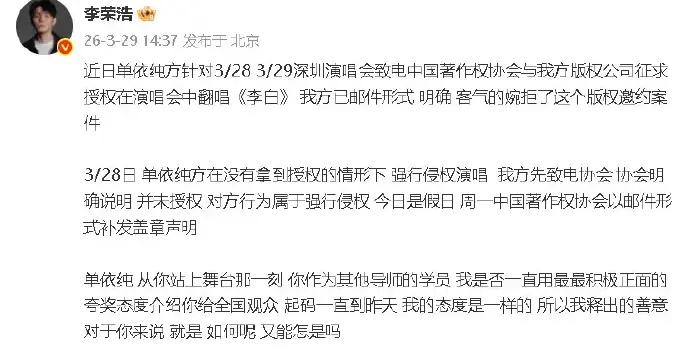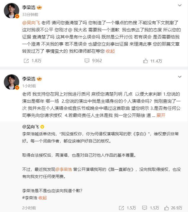 搜狐娛樂訊 28日,李榮浩再次發文回應吳向飛質疑其侵權唱歌一事,他詢問吳向飛有沒有查清楚,“您製造了一個爆點的熱搜,不能沒有下文就撤了,這對我很不公平” ,他說若有誤會,是否需要給自己一個澄清,若不是誤會,也望吳向飛能立刻拿出證據來理清此事,“您的那篇文章轉發過萬了,事情蠻大的,我和律師都在等您”。