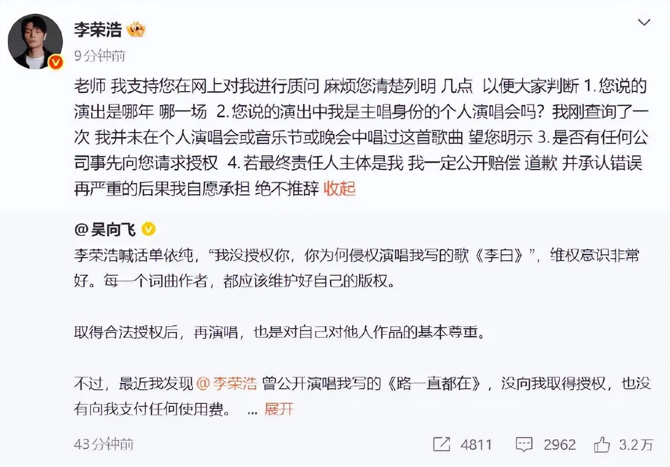 搜狐娛樂訊 28日,李榮浩回覆吳向飛 ,他稱“我支持您在網上對我進行質問”,但希望吳向飛能清楚列明演出時間等信息,並說“若最終責任人主體是我,我一定公開賠償道歉,並承認錯誤,再嚴重的後果我自願承擔,絕不推辭”。