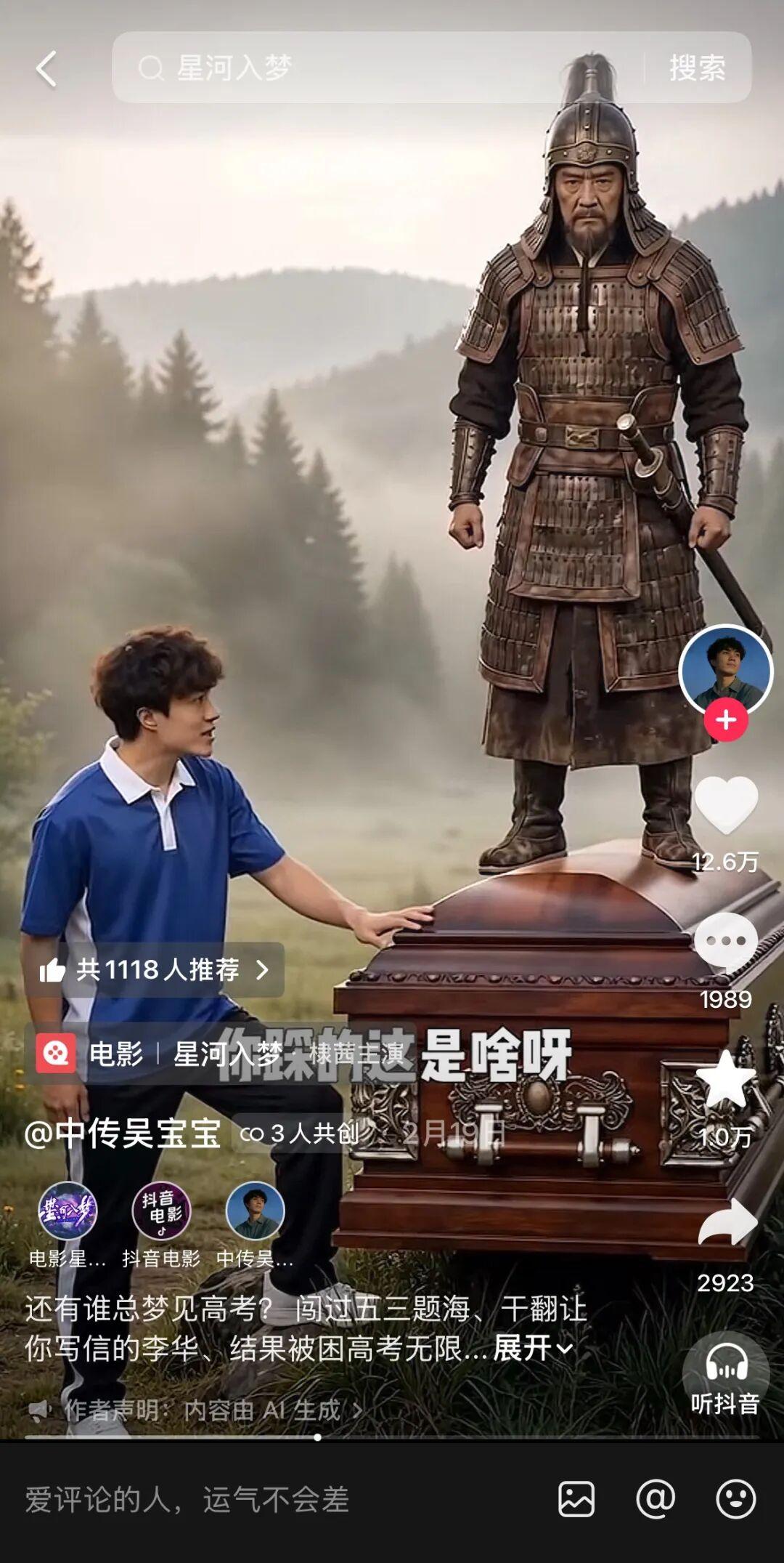 其實平臺已經撮合了很多創作者與影視綜創作者的交流,《那根棍子》的創作者@老布褶也分享了現場趣事,“吳京拍完之後並沒有走,鼓勵我們放開了玩,特別支持我們這次合作。而且我發現好幾位演員早就看過我們的賬號了,這種感覺太奇妙了,一個抖音創作者,永遠不知道到底哪些人藏在粉絲數那串茫茫的數字裏,被看見的感覺真好。”@中傳吳寶寶也與《星河入夢》導演韓延就“電影創作和AI”進行深度對談。