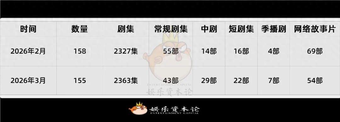 國家廣播電視總局今日發佈2026年3月全國拍攝製作電視劇(網絡劇)備案公示,本月共備案150 部,較 2 月微降 5.1%。從數據結構看,儘管長劇產能保持平穩,但“短劇集”與“網絡故事片”的佔比顯著提升,說明行業正在從單純的“長視頻爭奪”轉向“長短結合”的全域視頻內容生產。劇本儲備目前處於去庫存後的精品化迭代期,盲目立項減少,題材更加垂直。