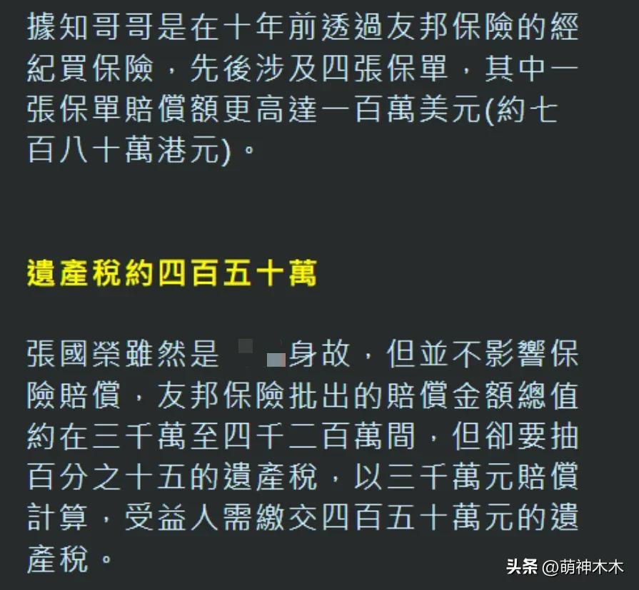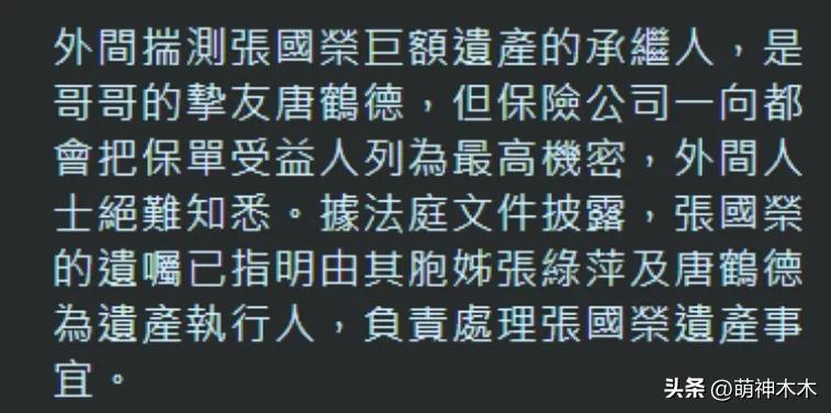 張國榮去世之後不久,就被港媒曝光了遺產分配,據說是張國榮家人透露的,金額並不一定完全準確,但繼承比例大致沒有問題,二十多年了,不管是張國榮家人還是愛人唐鶴德,都沒有出面否認過遺產分配傳聞。