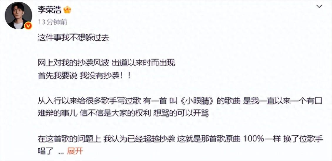 搜狐娛樂訊 1日,李榮浩在社交平臺發文回應抄襲爭議。據悉,2016年,樂評人鄧柯曾質疑李榮浩爲蔡淳佳作曲的《小眼睛》抄襲了平井堅2005年的作品《Signal》。全文如下: