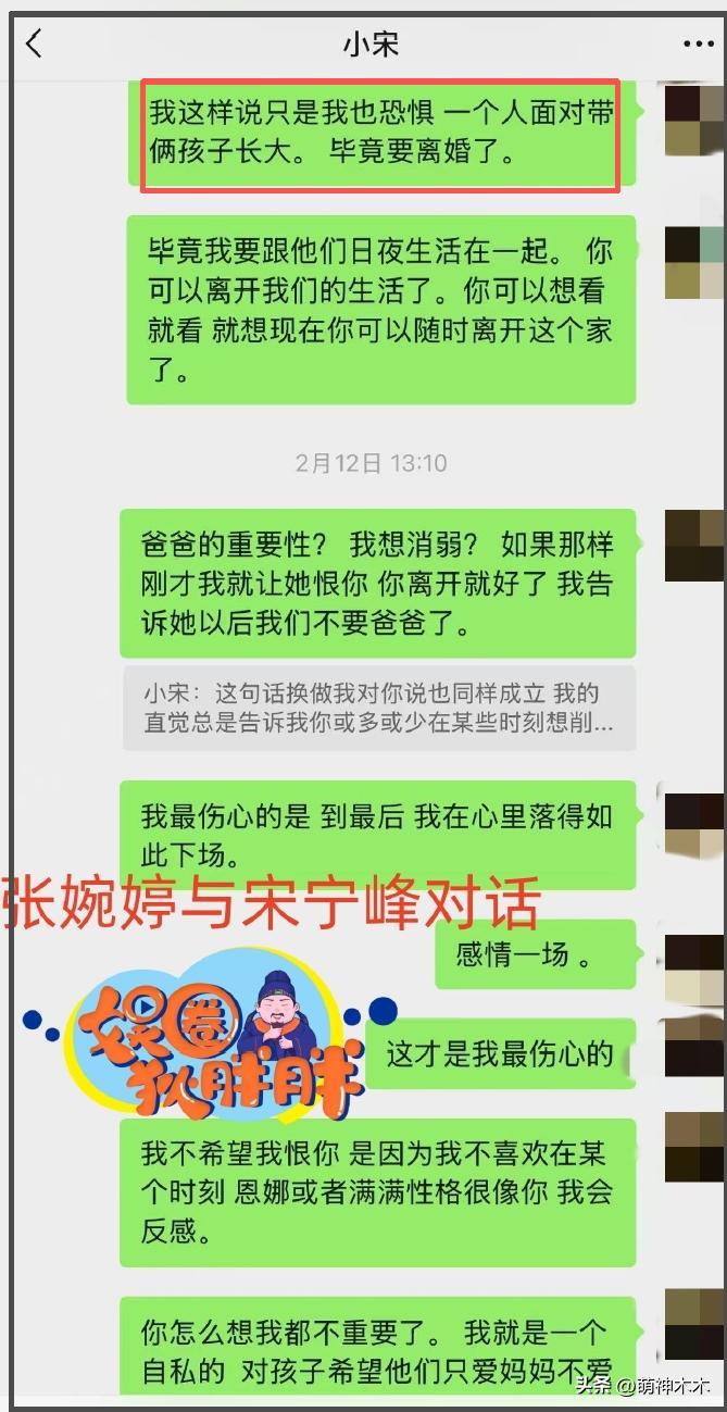 再根據張婉婷和宋寧峯的聊天記錄,也發現兩口子對離婚的態度截然不同。2月12日,宋寧峯向張婉婷提出離婚,張婉婷連續發十幾條文字,描述離婚後要和孩子面臨的窘境,比如“一個人帶兩個娃”、“如何解釋爸爸離開家”等,宋寧峯則偶爾回一句,不是催時間就是PUA張婉婷弱化爸爸存在感。