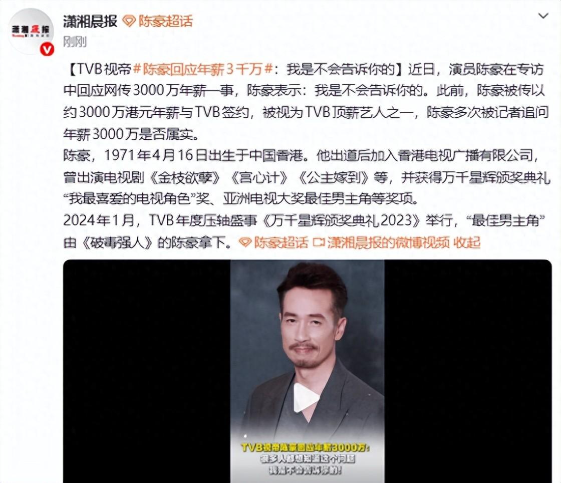 近日,演員陳豪在專訪中回應網傳3000萬年薪一事,陳豪表示:我是不會告訴你的。此前,陳豪被傳以約3000萬港元年薪與TVB簽約,被視爲TVB頂薪藝人之一,陳豪多次被記者追問年薪3000萬是否屬實。