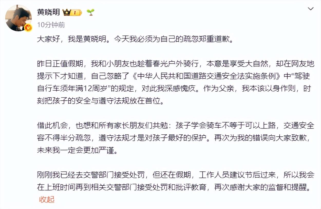 黃曉明說:“作爲父親,我本該以身作則,時刻把孩子的安全與遵守法規放在首位。藉此機會,也想和所有家長朋友們共勉:孩子學會騎車不等於可以上路,交通安全容不得半分疏忽,遵守法規纔是對孩子最好的保護。再次爲我的錯誤向大家致歉,未來我一定會更加嚴謹。剛剛我已經去交警部門接受處罰,但還在假期,工作人員建議節後過來,所以我會在上班時間再到相關交警部門接受處罰和批評教育,再次感謝大家的監督和提醒。”