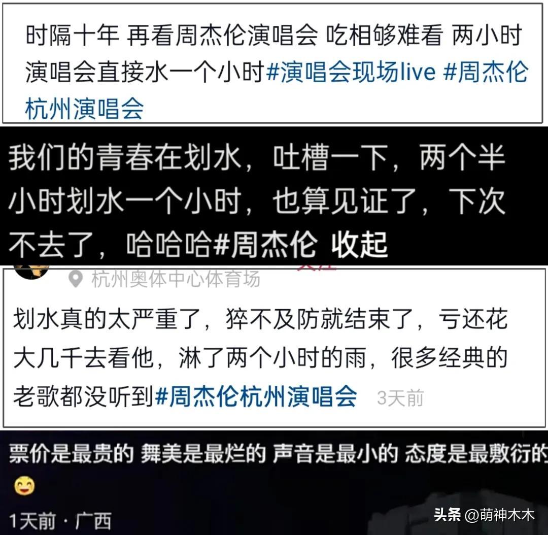 搜索周杰倫划水相關,粉絲的吐槽聲音很集中,首先不滿的就是演唱會演唱不足,兩個小時的時間有一個小時划水;其次舞美音響設備爛,話筒聲音小,觀衆聽不太清演唱。而且,周杰倫演唱會溢價嚴重,黃牛票還沒有徹底消失,很多花高價買票淋雨的粉絲都只能認了爲情懷買單,但是再沒有下次了。