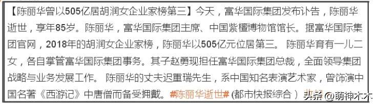 關於陳麗華的遺產狀況,此前有爆料稱她早在幾年前就已經提前立了遺囑,目的是防止子女爭奪資產,傳言稱子女每人平分100億,剩下的歸屬遲重瑞。根據訃告文,陳麗華名下擁有的核心財產主要有兩處,一個是富華國際集團,她生前擔任名譽主席,一個是中國紫檀博物館,生前擔任館長。