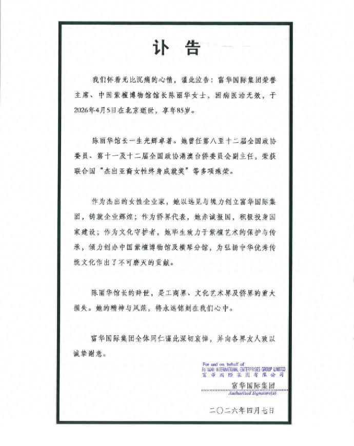 搜狐娛樂訊 富華國際集團4月7日發佈訃告:富華國際集團榮譽主席、中國紫檀博物館館長陳麗華女士,因病醫治無效,於2026年4月5日在北京逝世,享年85歲。