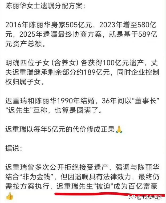 隨着她的離世,天價遺產分配也備受外界關注,據說陳麗華早就立下遺囑,對龐大資產做出了明確安排:她一共留下了約580億元的鉅額財產,四個兒女每人將繼承100億,同時兒子趙勇接手富華集團核心業務,扛起家族企業重任。而剩下的180億則全部由丈夫遲重瑞繼承,並且會繼承陳麗華最喜愛的中國紫檀博物館,繼續守護兩人共同熱愛的文化收藏事業。這樣的安排既穩妥又體面,也盡顯她對家庭的周全考量。