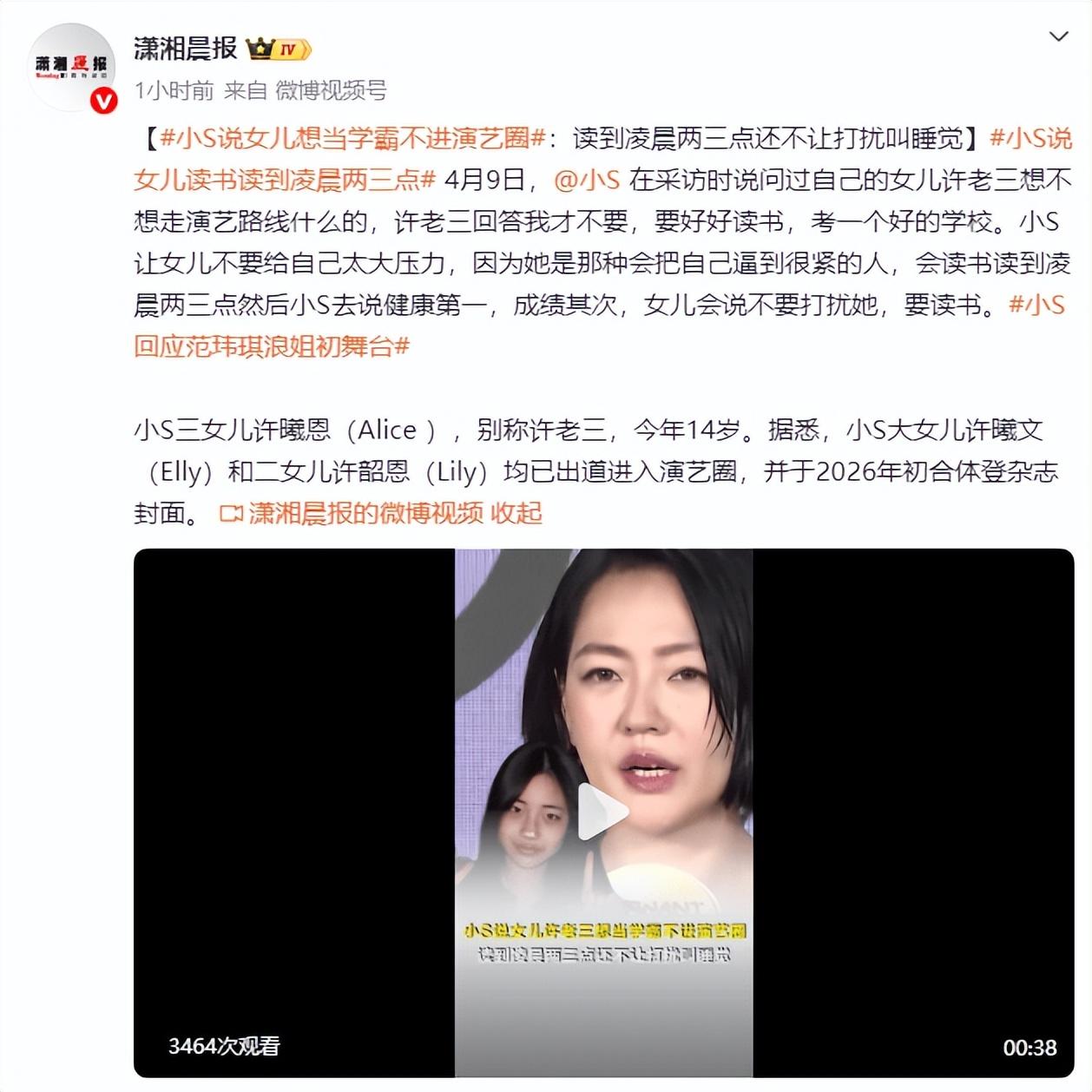 4月9日,小S在採訪時說問過自己的女兒許老三想不想走演藝路線什麼的,許老三回答我纔不要,要好好讀書,考一個好的學校。小S讓女兒不要給自己太大壓力,因爲她是那種會把自己逼到很緊的人,會讀書讀到凌晨兩三點然後小S去說健康第一,成績其次,女兒會說不要打擾她,要讀書。