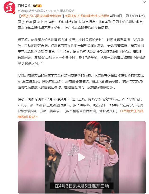 4月10日,周杰倫經紀公司“傑威爾”回應“划水”爭議,稱演唱會總時長符合標準。此前4月6日周杰倫杭州演唱上,網友指其實際演唱不足90分鐘,存在找嘉賓聊天拖時長等問題。