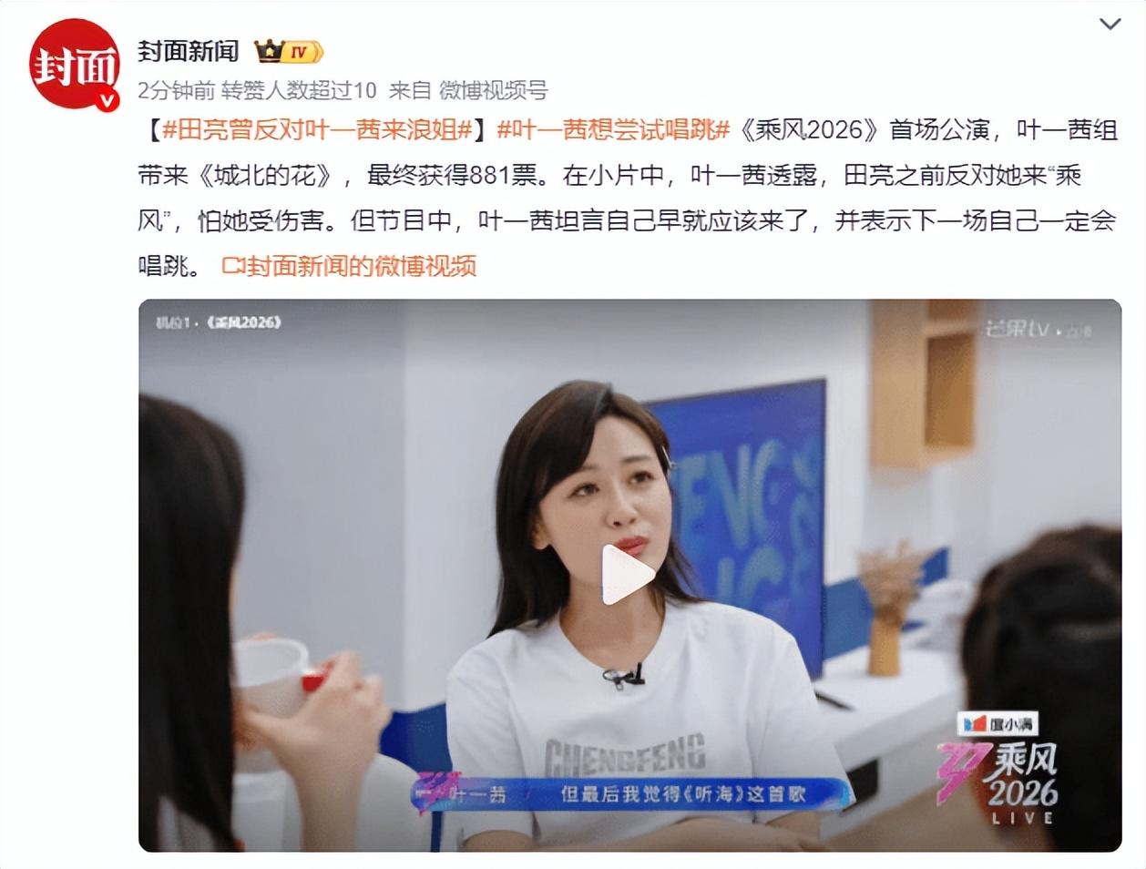 《乘風2026》首場公演,葉一茜組帶來《城北的花》,最終獲得881票。在小片中,葉一茜透露,田亮之前反對她來“乘風”,怕她受傷害。但節目中,葉一茜坦言自己早就應該來了,並表示下一場自己一定會唱跳。