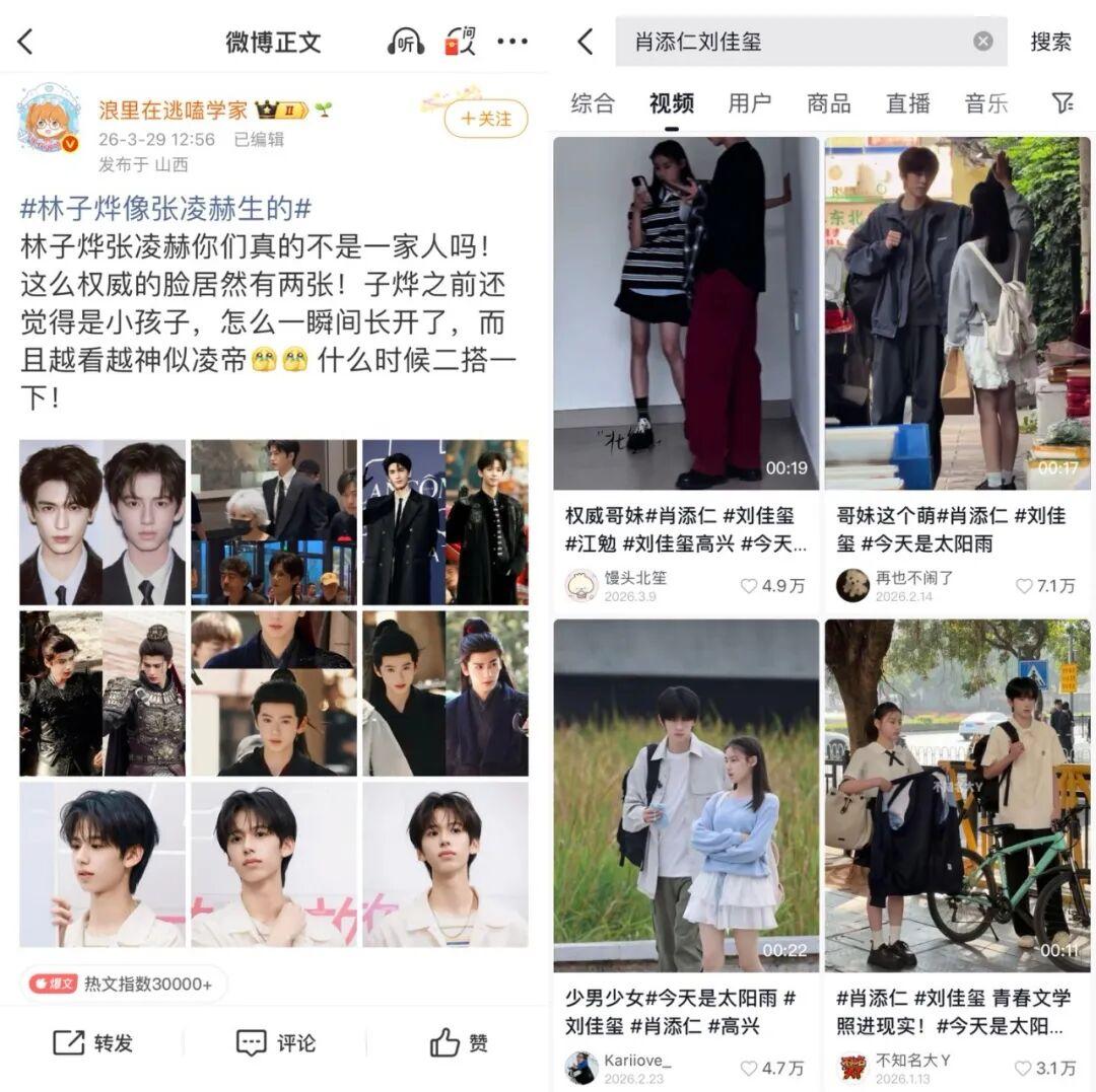 由於更大的年齡差,10後還更方便和當紅的95後互炒。如“小張凌赫”林子燁、“小陳星旭”徐崴羅,“趙露思御用弟弟”傅鉑涵、“虞書欣的好朋友”陳芷琰。
