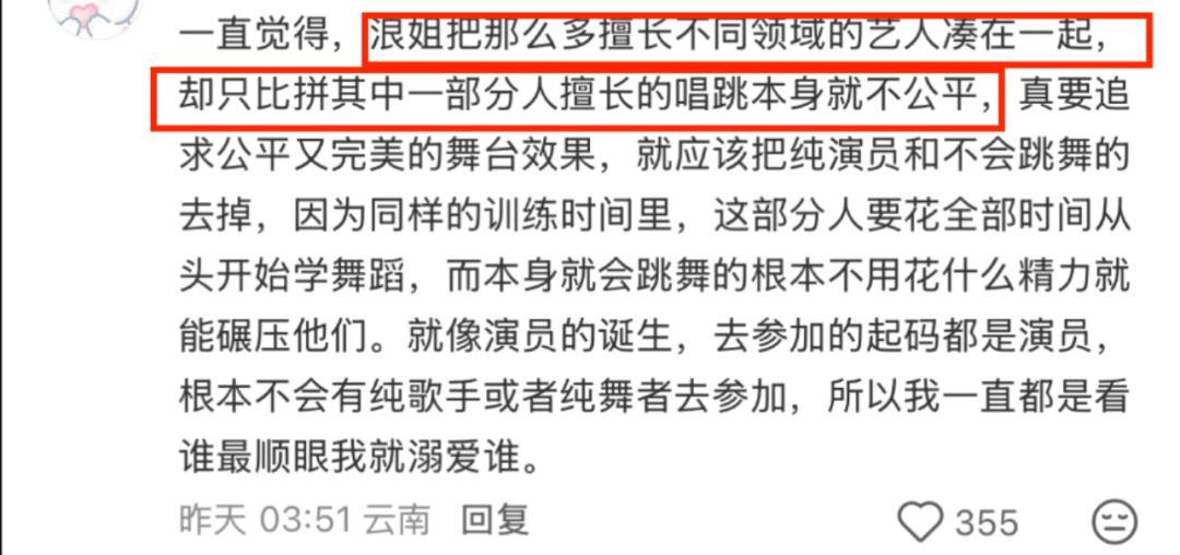 而且這麼「可樂」的舞臺,是能傳遞情緒價值的,當綜藝節目的娛樂屬性被無限放大,觀衆力挺似乎也是能理解的?