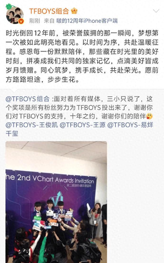 搜狐娛樂訊 4月15日,TFBOYS官方發文慶祝415十二週年,他們寫道:“時光倒回12年前,被榮譽簇擁的那一瞬間,夢想第一次被如此明亮地看見。以時間爲序,共赴溫暖征程。感恩每一份默默陪伴,那些藏在時光裏的美好時刻,拼湊成我們共同的獨家記憶,點滴美好皆成歲月饋贈。同心築夢,攜手成長,共赴榮光。願前方路路坦途,步步生花。”並轉發了TFBOYS出席活動接受採訪的發文。