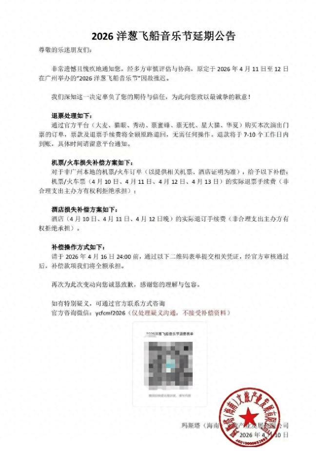 4月9日晚,原定4月11日至12日舉辦的廣州洋蔥飛船音樂節突然緊急取消,彼時部分參演嘉賓已抵達廣州,次日主辦方僅發佈聲明稱因故推遲,並推出機酒賠償方案。該音樂節嘉賓集結了李宇春、華晨宇、黃子弘凡等一衆知名藝人,臨時取消讓不少購票粉絲措手不及。