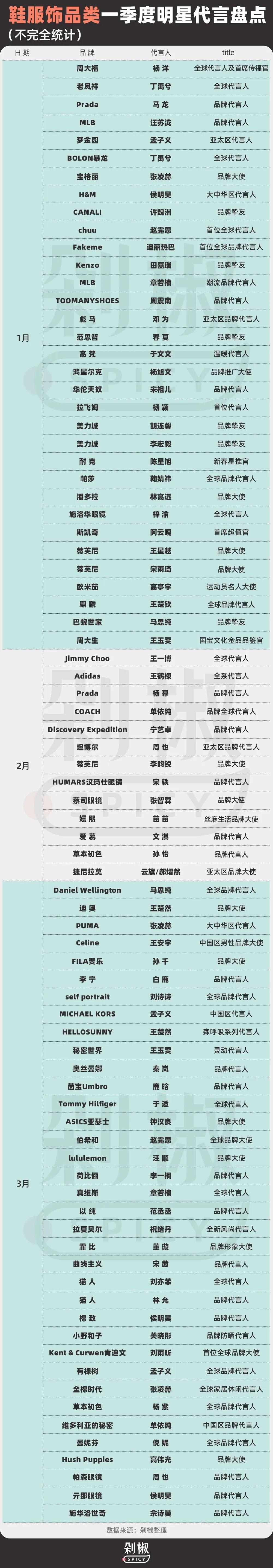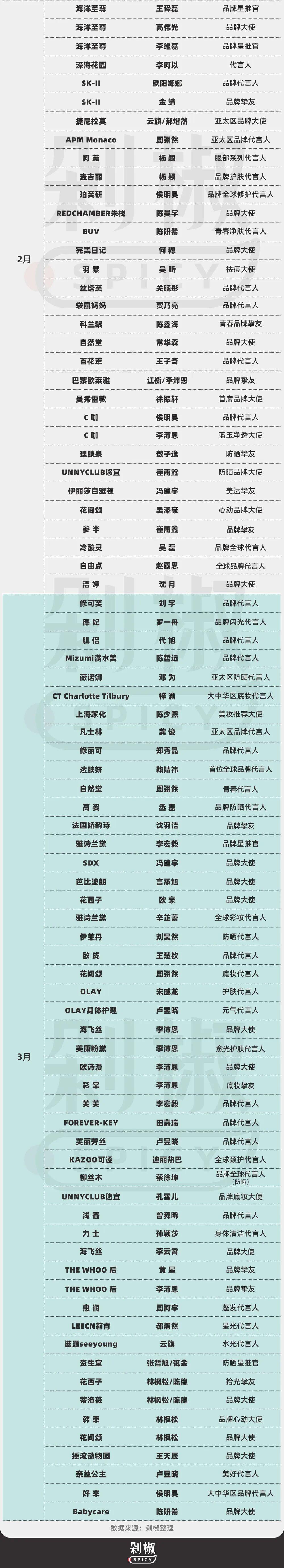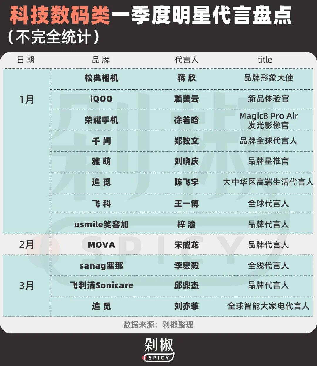 綜合來看,今年一季度的明星代言市場的可謂烈火烹油,本質上是一場高壓力下的賭博遊戲。品牌不再有耐心等待長期回報,每一分代言費都要看到轉化數據、話題效果。這樣的市場風向還會持續多久?剁椒Spicy也將對二季度市場持續關注。